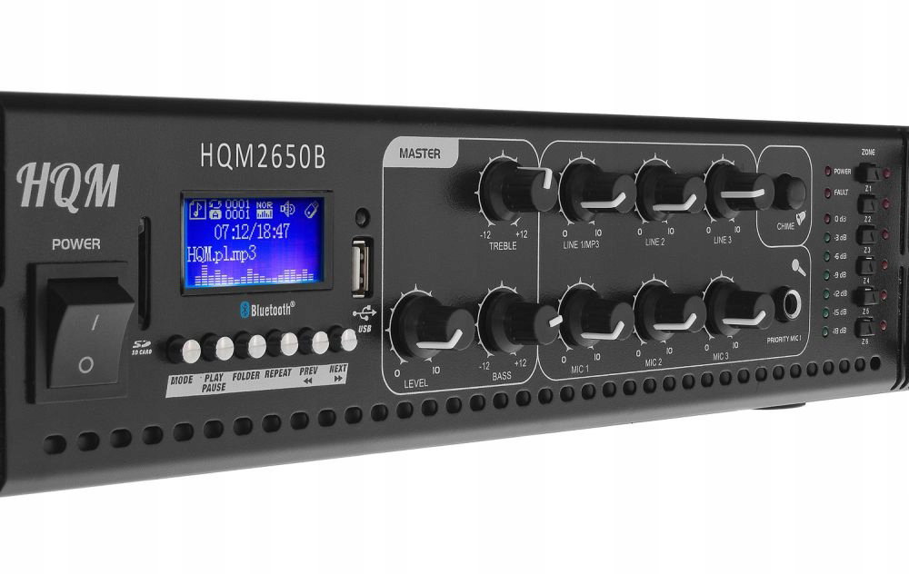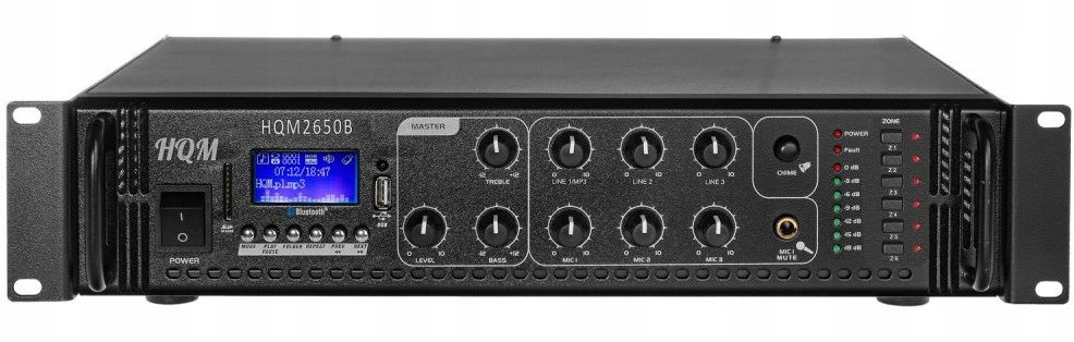 Wzmacniacz radiowęzłowy dużej mocy HQM2650BC 650W jest wyposażony w obudowę w standardzie rack. Urządzenie posiada 6 stref głośnikowych oraz 3 wyjścia AUX. HQM typu PA cechuje się dobrymi parametrami muzycznymi, doskonałą jakością dźwięku i nowoczesnymi rozwiązaniami technicznymi. Wbudowany w urządzeniu tuner AM/FM oraz Bluetooth z obsługą plików MP3, w jeszcze większym stopniu wzbogacają zakres funkcjonalności wzmacniacza. Kolejna z cech urządzenia jest złączę USB oraz slot na kartę SD.