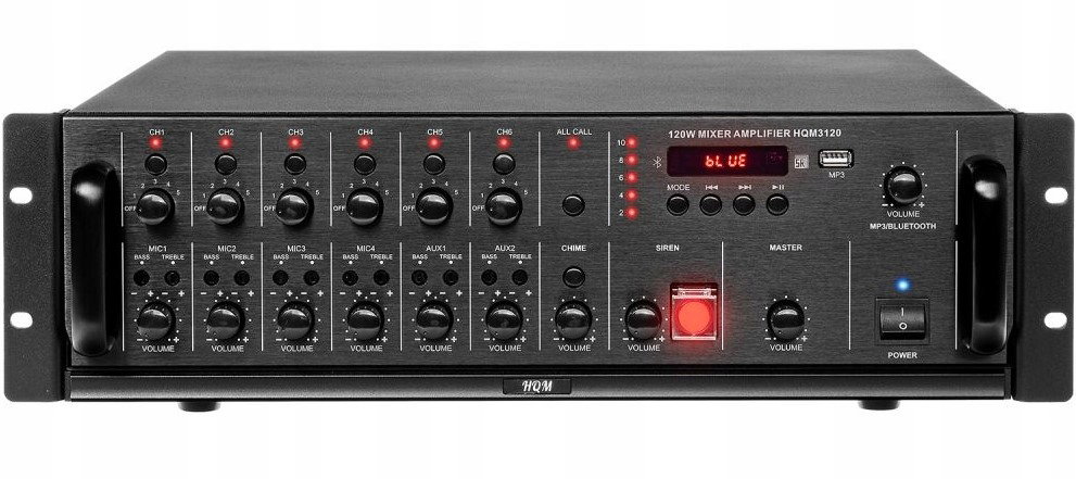 Wzmacniacz miksujący PA HQM3120 120W to nowoczesne urządzenie audio stworzone z myślą o realizacji niezawodnych systemów nagłośnienia. Sygnowany logiem HQM (High Quality Music) należy do części innowacyjnej serii produktów, umożliwiających niezawodną oraz nowoczesną prace w dostarczaniu dźwięku. Zastosowana w centrali wystarczająca moc wyjściowa oraz wyjścia z podziałem na 6 strefy głośników, pozwolą na zasilenie średnich i dużych systemów nagłaśniających. Urządzenie cechuje się prostą obsługą, bezawaryjną pracą oraz solidnym wykonaniem. Dodatkową zaletą wzmacniacza HQM-3120 jest wbudowany odtwarzacz MP3 oraz Bluetooth z wyświetlaczem LED. Wzmacniacz HQM3120 posiada gong oraz syrenę.