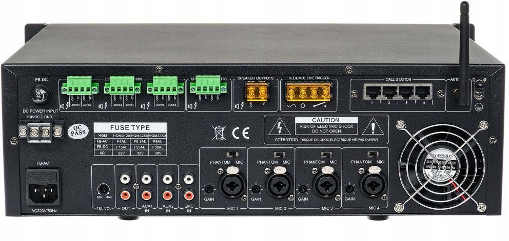 Urządzenie zostało wyposażone w 4 wejścia mikrofonowe (MIC) oraz 2 wejścia liniowe AUX, co umożliwia podłączenie wielu źródeł dźwięku – mikrofonów, odtwarzaczy audio, komputerów czy systemów komunikatów głosowych. Wzmacniacz obsługuje również zasilanie Phantom 48V, dzięki czemu można korzystać z profesjonalnych mikrofonów pojemnościowych. Dodatkowo dostępne są terminale do podłączenia mikrofonów pulpitowych oraz wejście telefoniczne do integracji z systemami komunikacji.