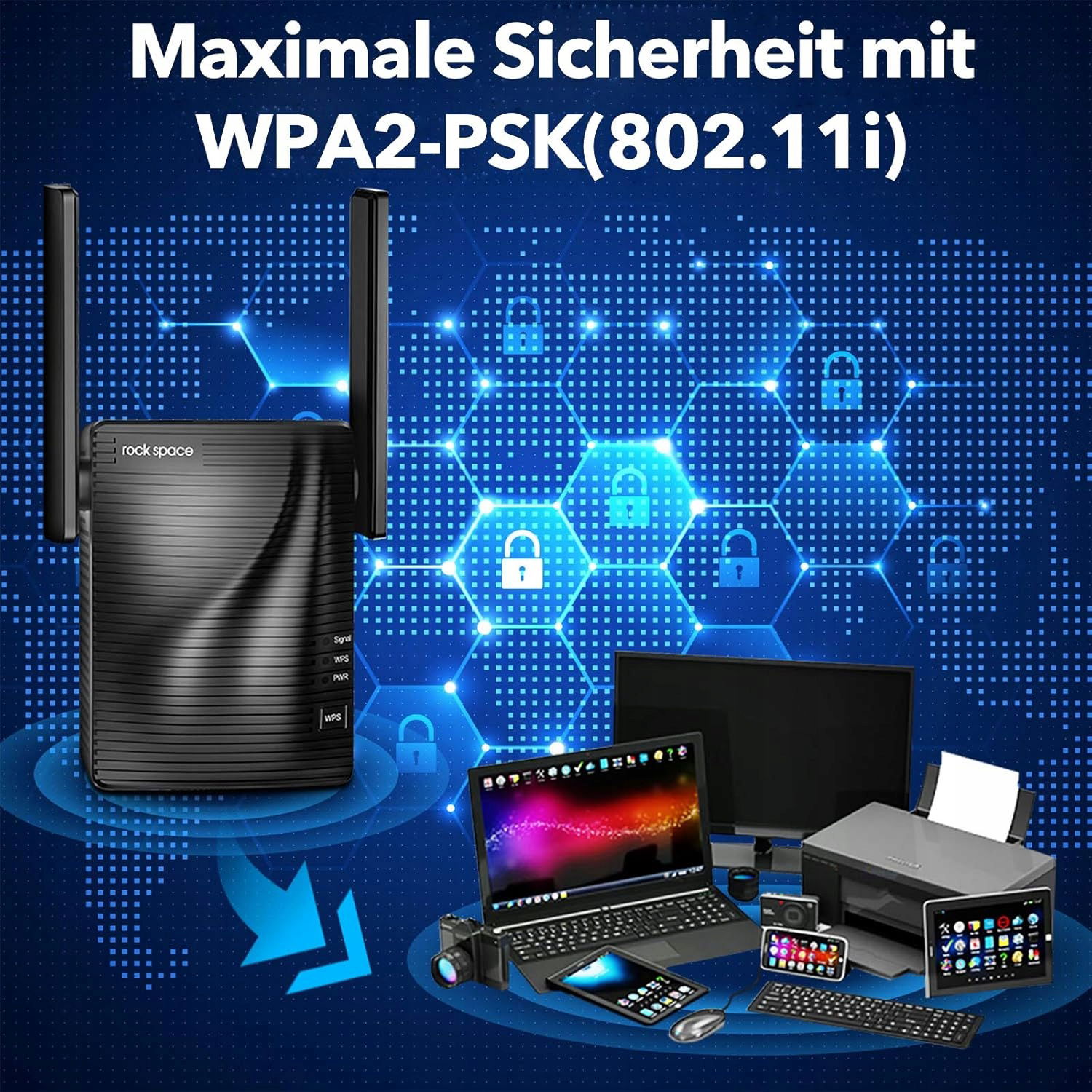 Bezpieczeństwo sieci zapewnia zastosowanie standardów WPA2-PSK oraz prostą konfigurację poprzez przycisk WPS. Anteny wielokierunkowe rozszerzają zasięg bez białych stref.