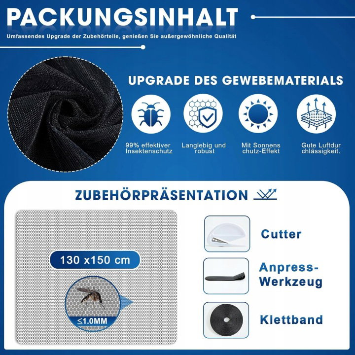 ⭐Moskitiera o wymiarach 130 x 150 cm, którą można indywidualnie dopasować do okna. Siatka o oczkach poniżej 1 mm skutecznie blokuje owady, takie jak komary i muchy, chroniąc Twoją rodzinę przed ukąszeniami – zapewniając relaksujące letnie wieczory.