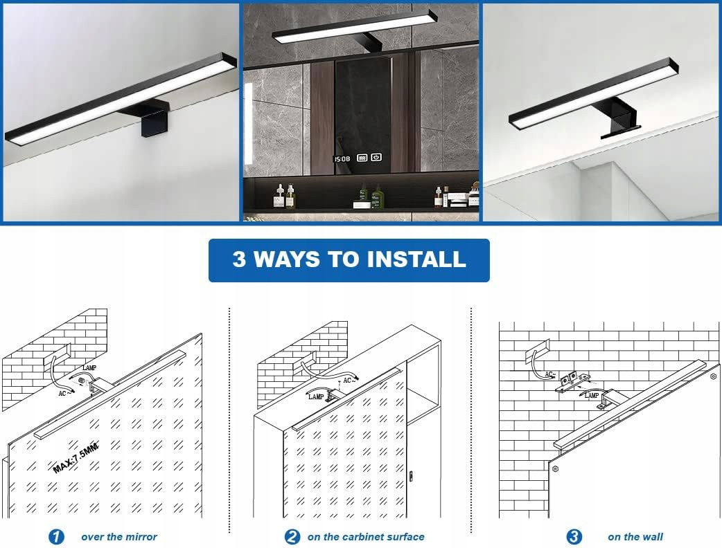 - Praktyczne 3 opcje montażu: Dzięki dostarczonym klipsom montażowym to lustro można zamontować na szafkach i ścianach. Można ją również przymocować bezpośrednio do lustra jako lampę natynkową. Wstępnie nawiercone i zdejmowane wsporniki umożliwiają łatwy i zmienny montaż na dowolnym meblu.