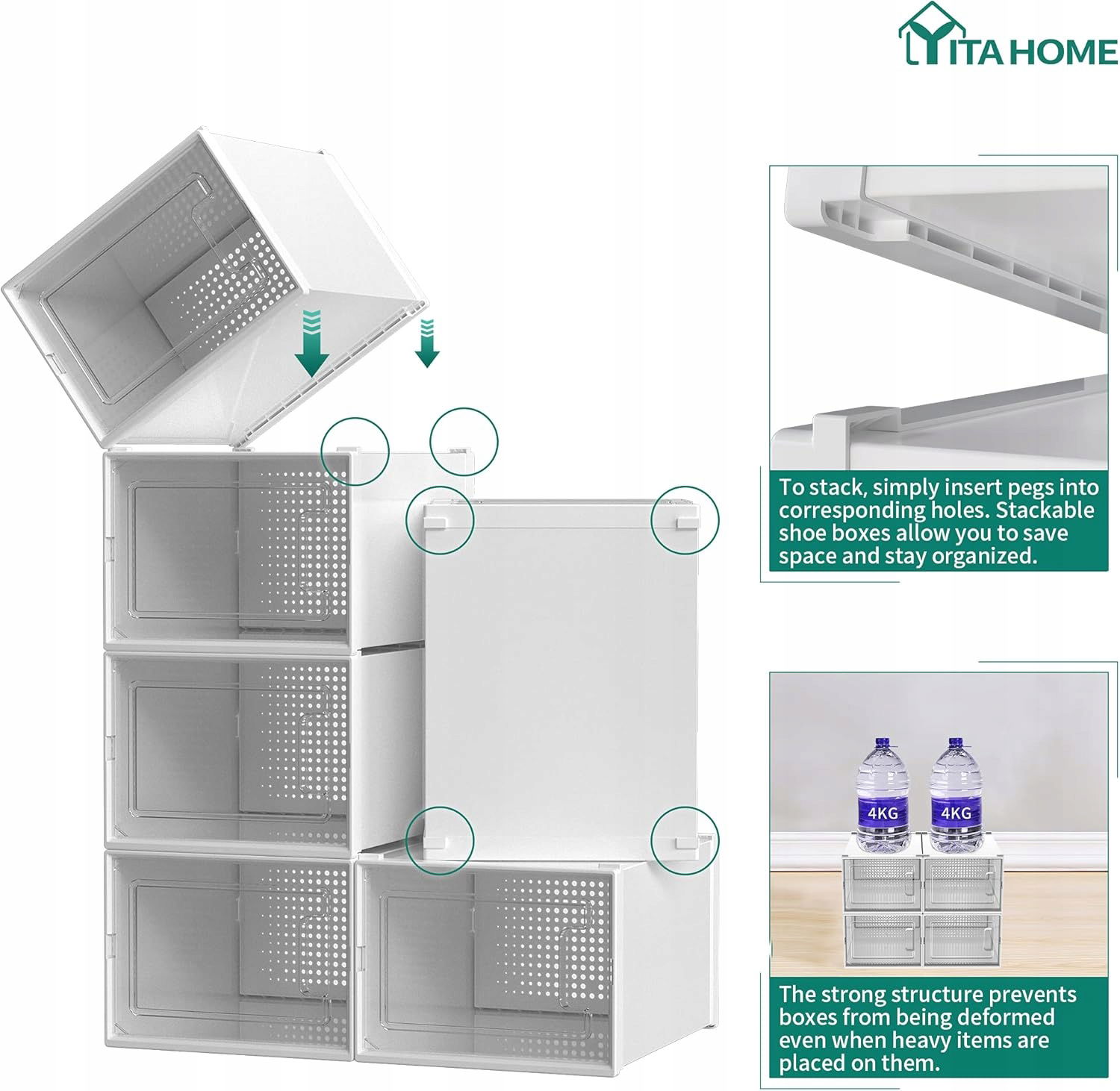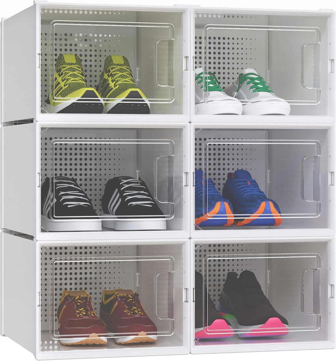 Zestaw 6 pudełek na buty YITAHOME to idealne rozwiązanie do utrzymania porządku w domu. Każde pudełko ma wymiary 35,8 × 27,7 × 20,8 cm, dzięki czemu pomieści obuwie aż do rozmiaru UK 14 (EU 48). Pojemniki świetnie nadają się do sneakersów, szpilek, sandałów czy obuwia sportowego.