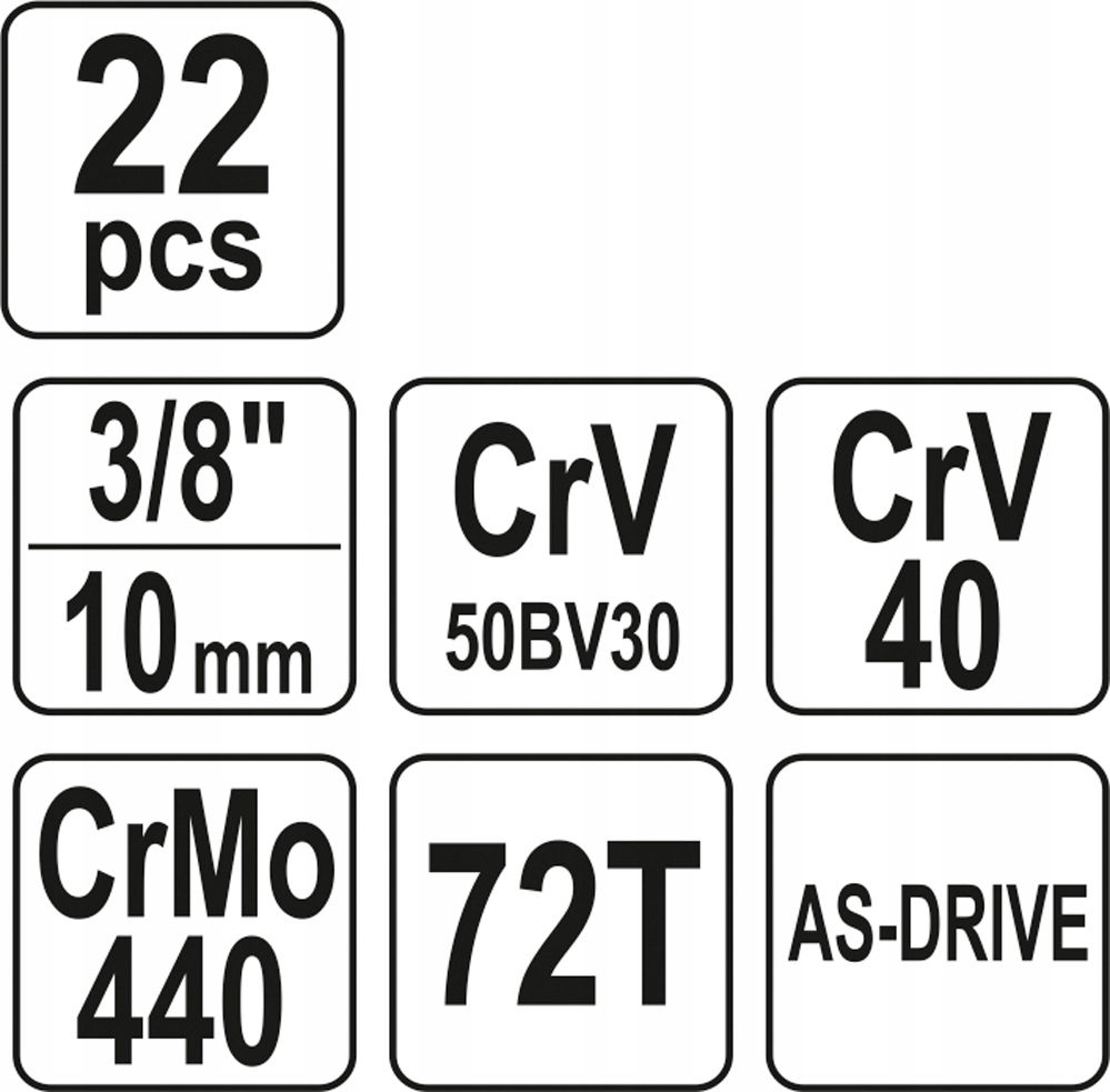 Zestaw umożliwia pracę wymagającą bardzo dużych obciążeń i precyzji, pozwala wykonywać wiele czynności serwisowych związanych z odkręcaniem i przykręcaniem połączeń gwintowych o różnych rozmiarach nominalnych. Grzechotka posiada trójkomponentową rękojeść oraz 72 zęby (skok roboczy 5 stopni).