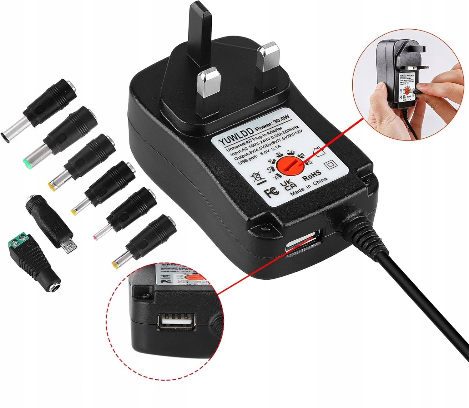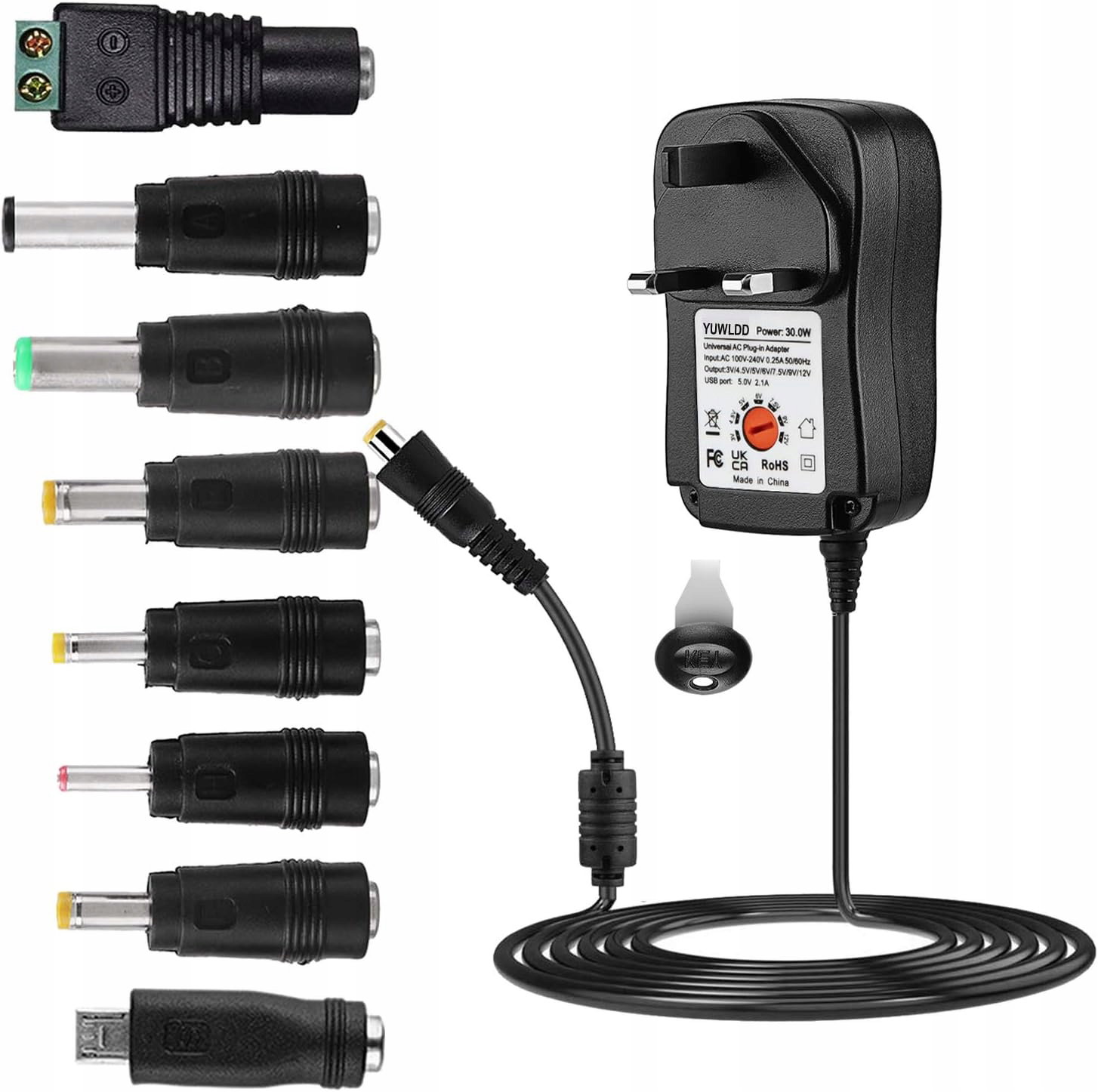 YUWLDD Międzynarodowy zasilacz wielofunkcyjny z MicroUSB – 100-240V, 3V-12V, 2A, 8 wtyczek konwersyjnych WTYCZKA UK