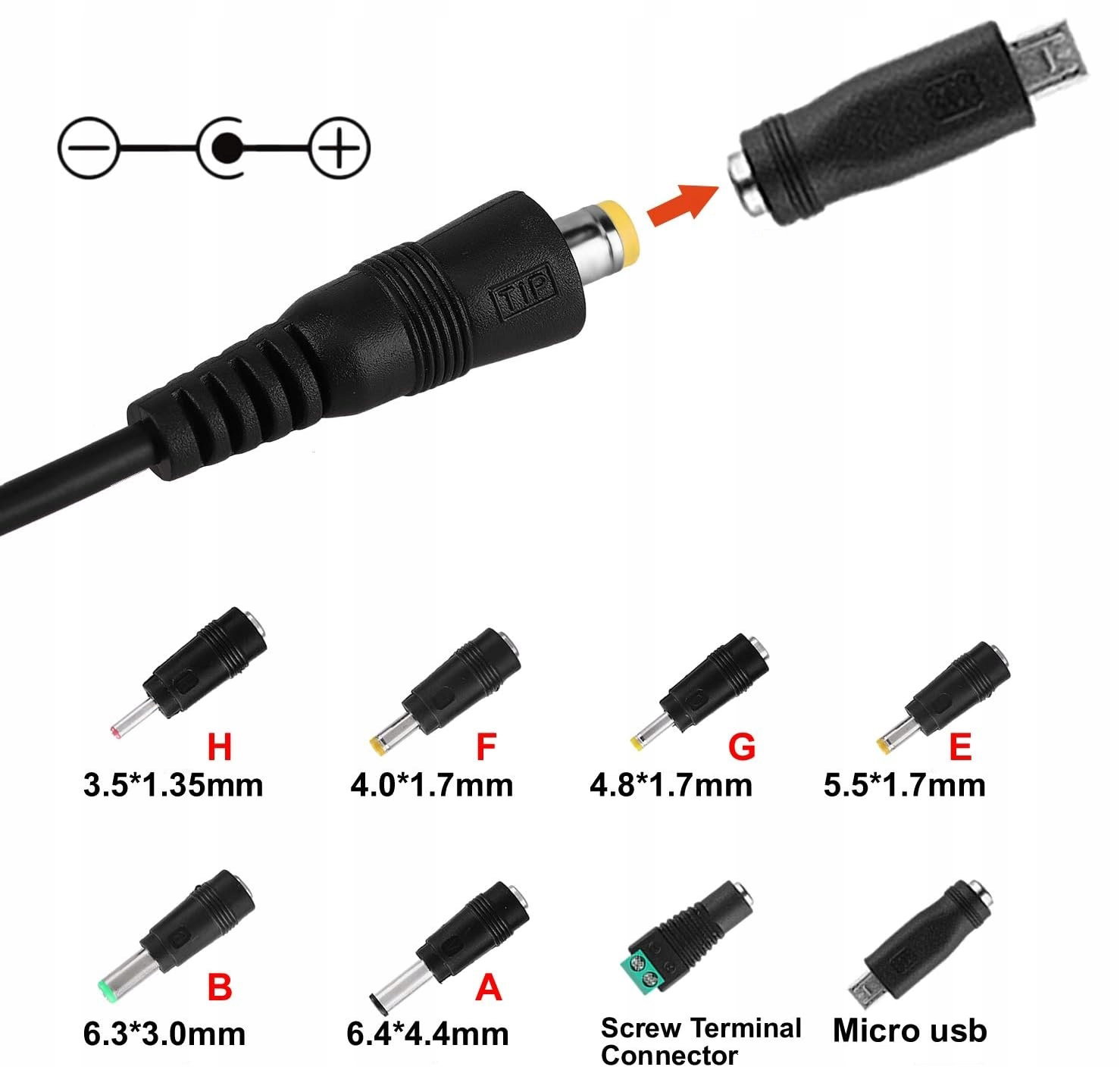 - Wymienne końcówki: 8 różnych końcówek konwersyjnych, w tym końcówka DC 5,5*2,1 mm