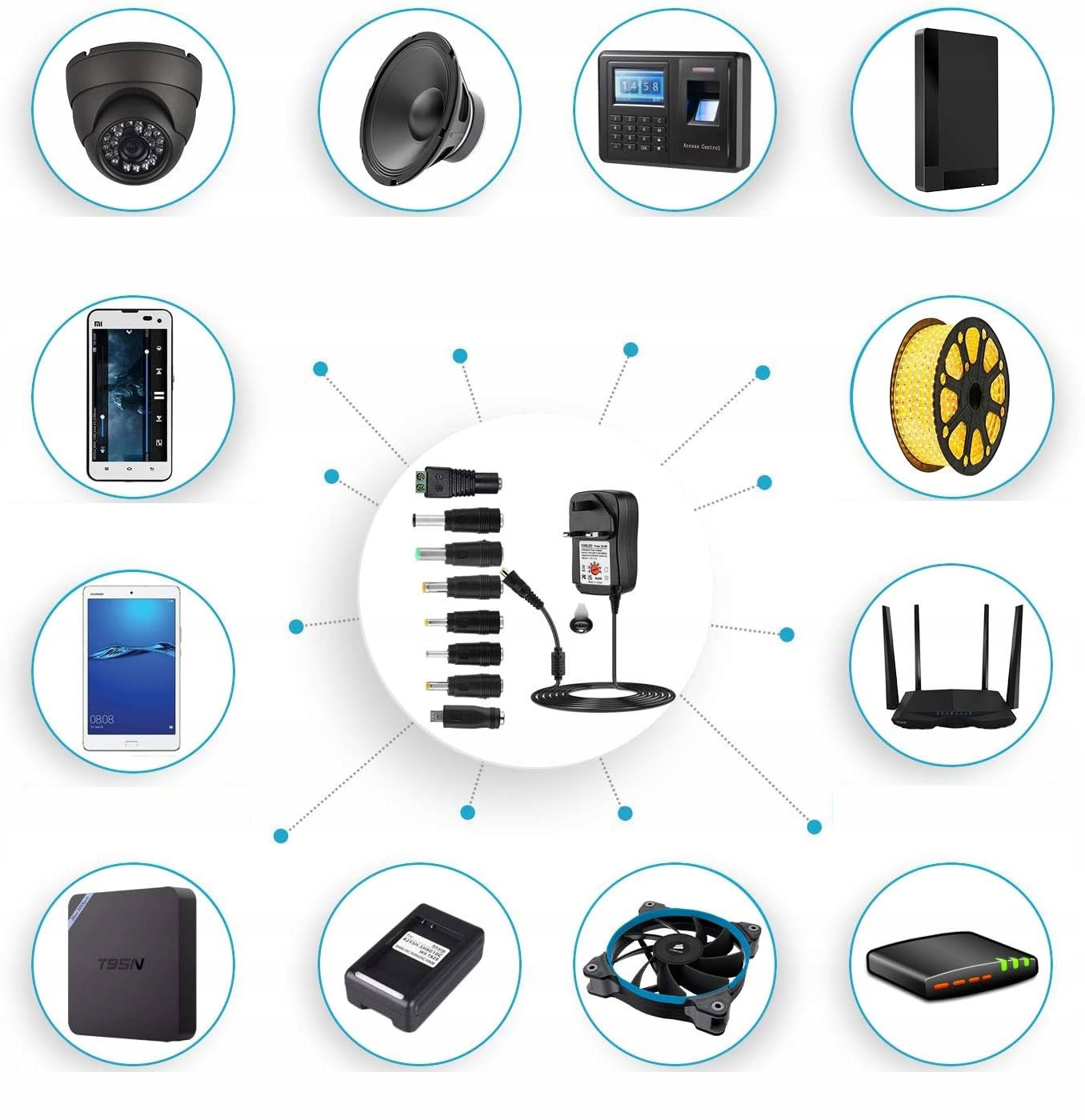 Zasilacz obsługujący szeroki zakres napięć (3V-12V) zapewnia kompatybilność z wieloma urządzeniami, oferując odpowiednią moc do zasilania smartfonów, tabletów, aparatów, routerów i innych małych urządzeń elektronicznych.
