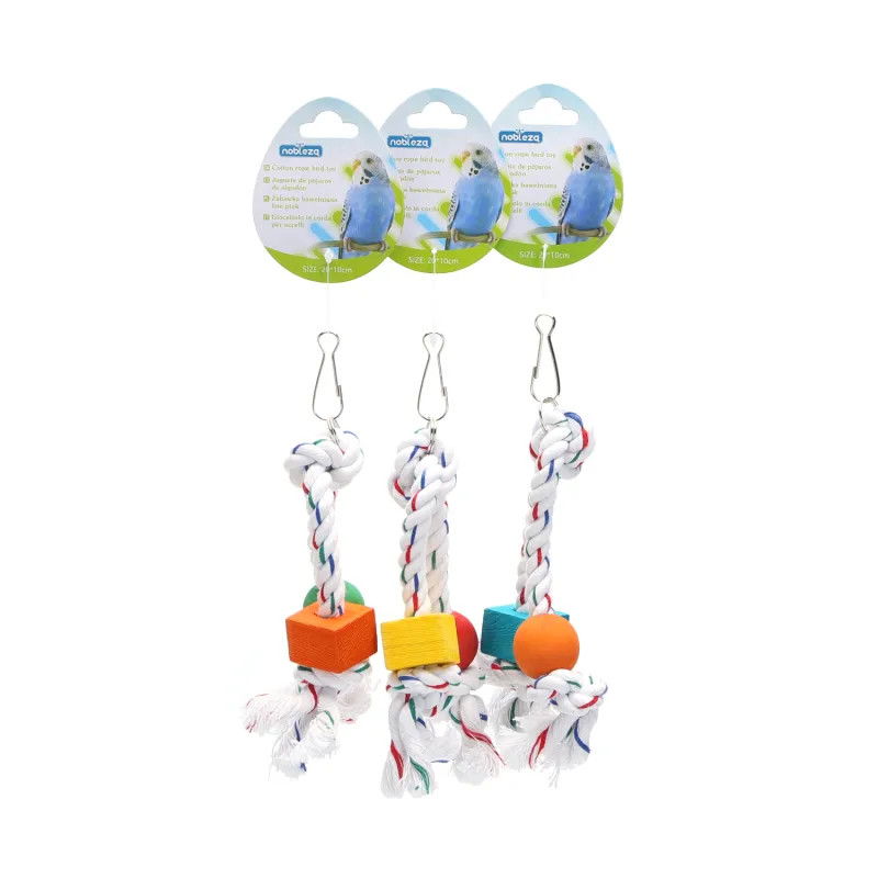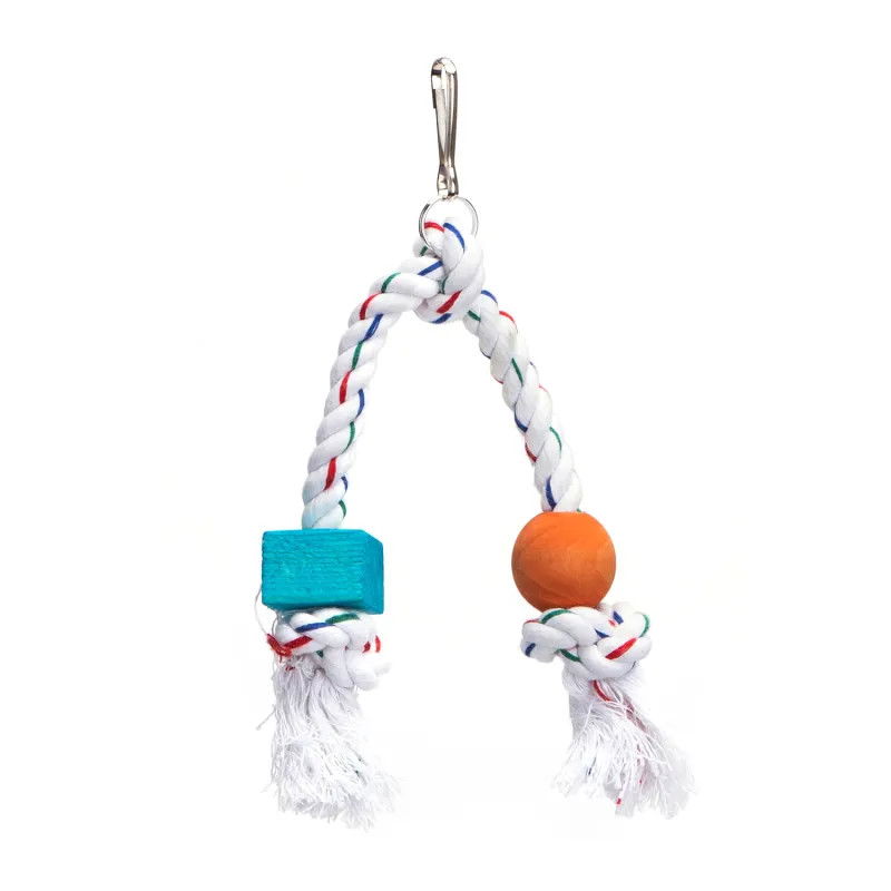 Za pomocą klipsa można go wygodnie i pewnie zawiesić. Wykonany jest z kolorowej i przyjaznej dla środowiska liny bawełnianej o dobrej odporności na zużycie, wykonanej z naturalnego drewna o różnych kształtach i pomalowanej jadalną farbą, nietoksyczną i nieszkodliwą.