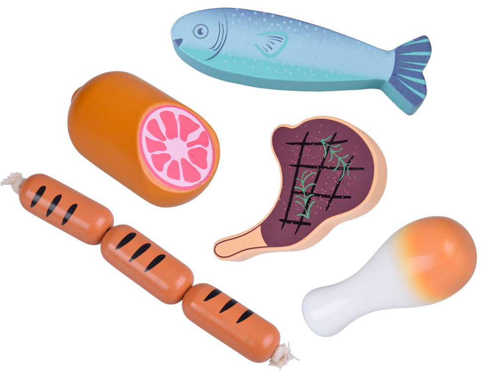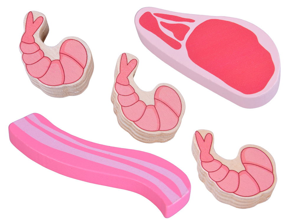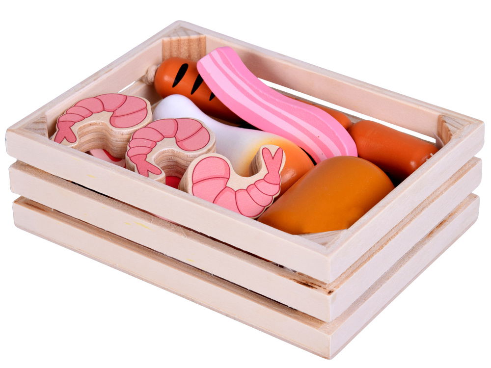 Drewniana skrzynia wędlin to niezwykły zestaw, który zachwyci każde dziecko z zamiłowaniem do kulinariów! Wykonana z trwałego drewna i pomalowana nietoksycznymi farbami, skrzynia zawiera wszystkie niezbędne mięsne produkty do zabawy. Kiełbaski, salami, nóżka z kurczaka, plaster mięsa wołowego, krewetki, plaster boczku i ryba – wszystko to znajdziesz w drewnianej skrzyni o wymiarach 12,5 cm x 17 cm x 5 cm.