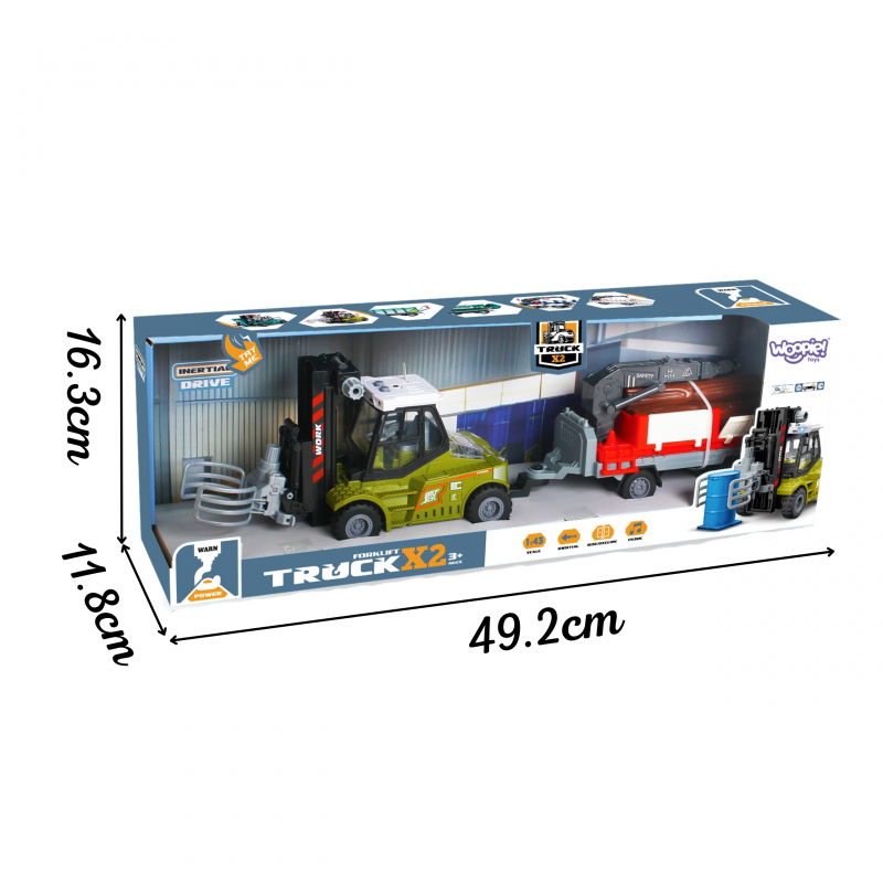 to nie tylko interesująca propozycja dla małych miłośników maszyn transportowych, ale także doskonałe narzędzie rozwijające umiejętności dziecka. Wykonany z trwałych materiałów o wysokiej jakości, zapewnia bezpieczną i długotrwałą zabawę. Napęd inercyjny sprawia, że wózek porusza się samodzielnie po pchnięciu, co dodatkowo zachęca do kreatywnej zabawy. Ruchomy chwytak umożliwia podnoszenie i przewożenie drewnianych kłód, a otwierane boki przyczepy ułatwiają załadunek i rozładunek. Efekty świetlne i dźwiękowe dodają realizmu, sprawiając, że zabawa staje się jeszcze bardziej emocjonująca. Zabawka rozwija wyobraźnię przestrzenną, umiejętności manualne, koordynację wzrokowo-ruchową oraz zmysł słuchu i wzroku. W zestawie znajduje się wózek widłowy z chwytakiem, przyczepa z hakiem i drewniane kłody do załadunku. To idealna propozycja dla dzieci powyżej 3 roku życia, które chcą poznać świat maszyn budowlanych i transportowych. Wymiary produktu to 45 x 12 x 8.5 cm, natomiast opakowania to 50 x 12 x 16.5 cm.