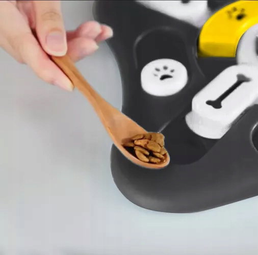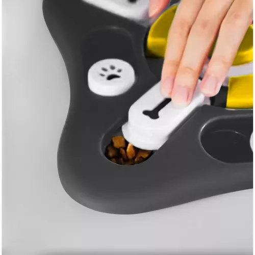 - DUŻA ILOŚĆ PRZEGRÓDEK - zaprojektowana specjalnie tak by pies miał czas na zabawę, duża ilość przegródek sprawi, że pies będzie odkrywał przekąski w każdej przegródce. Środkowe puzzle obracają się o 360 stopni, a przycisk wydaje sympatyczny dźwięk.