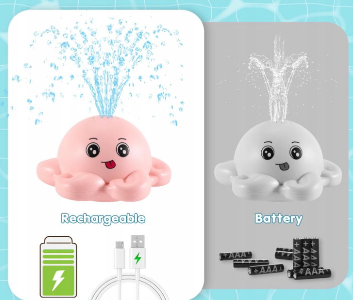 - ✴️Oszczędzaj pieniądze: W przeciwieństwie do innych starszych zabawek do kąpieli w kształcie ośmiornicy, używamy wysokiej jakości akumulatora o pojemności 1500 mAh, który po pełnym naładowaniu może rozpylać wodę przez 150 minut. Czas rozpylania wody przez nasz akumulator o pojemności 1500 mAh jest czterokrotnie dłuższy niż w przypadku 3 baterii AAA i nie trzeba już wymieniać baterii.
