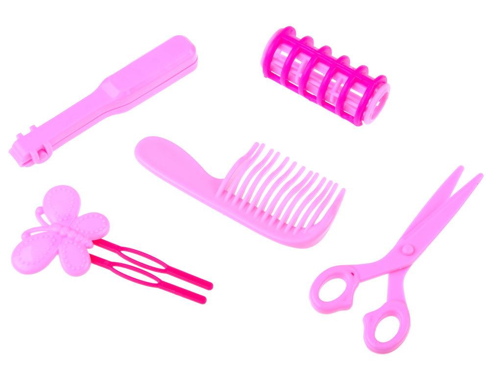 W zestawie znajdują się niezbędne akcesoria do stylizacji, takie jak grzebień do rozczesywania włosów, wałek do tworzenia loków i fal, prostownica do zabawy w prostowanie włosów, nożyczki do odgrywania scenek z salonu fryzjerskiego oraz wsuwka z motylkiem do ozdabiania gotowych fryzur. Dzięki temu dziecko rozwija zdolności manualne, cierpliwość, dokładność i kreatywność, wcielając się w rolę prawdziwego stylisty.