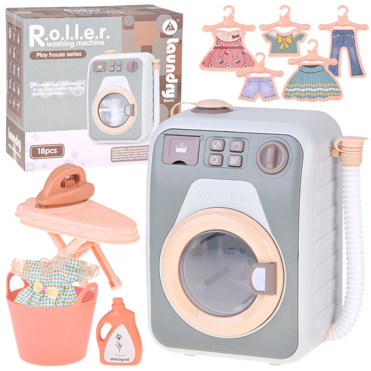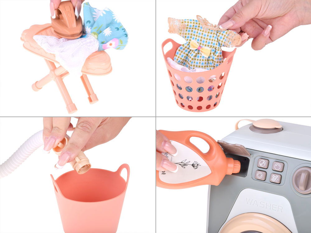Panel dotykowy z przyciskami programów umożliwia uruchomienie pralki oraz odtwarzanie wesołych melodii i dźwięków prania. Zestaw zawiera również deskę do prasowania, żelazko, wieszaki na pranie, kosze na pranie oraz butelki detergentów, które sprawią, że zabawa stanie się jeszcze bardziej realistyczna.