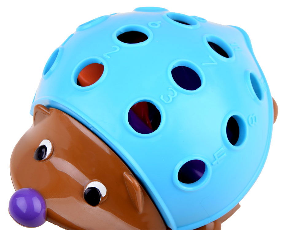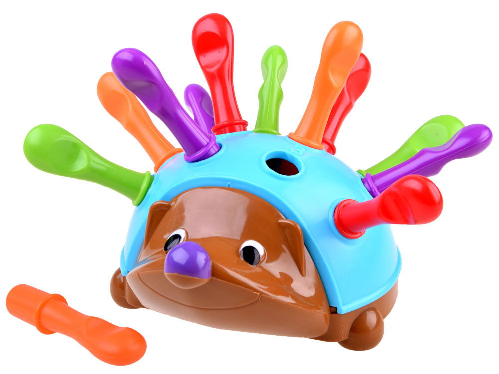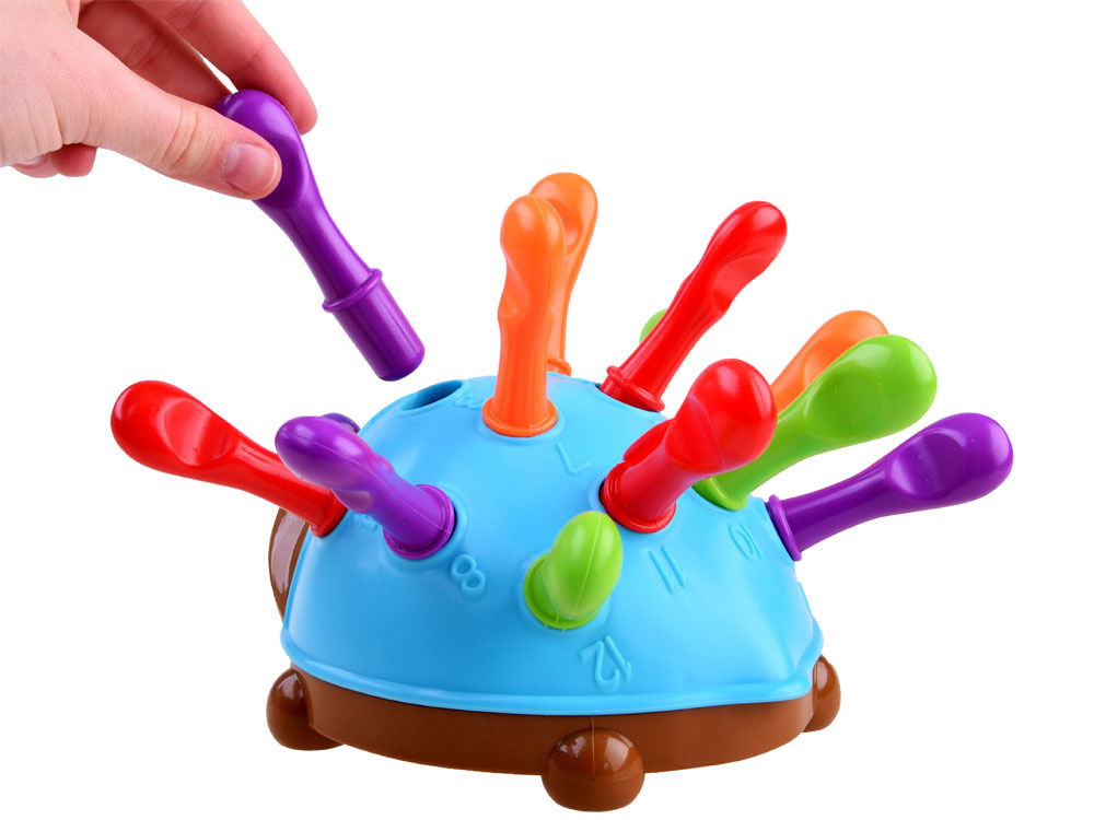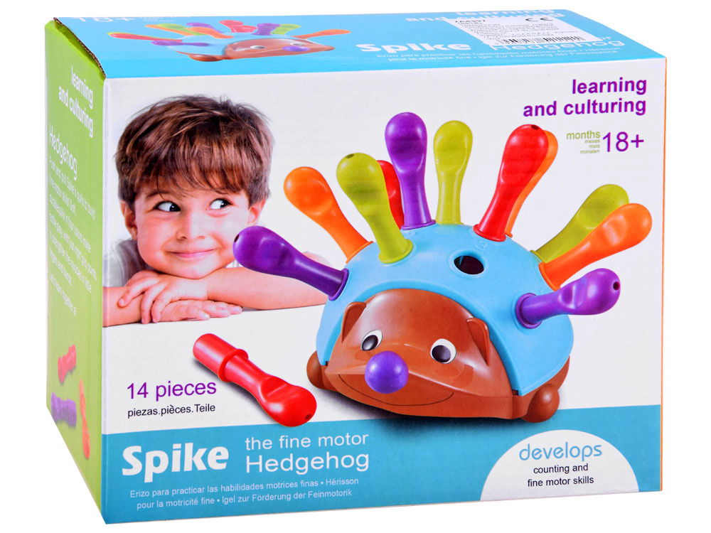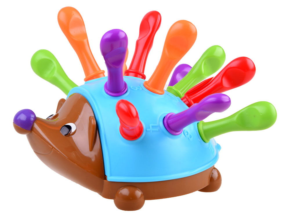 W zestawie znajduje się jeż ze zdejmowanym grzbietem oraz 12 kolorowych kolców w trzech różnych kolorach: pomarańczowym, czerwonym i fioletowym. Na grzbiecie jeża znajdują się także wytłoczone cyfry, które pomagają dziecku w nauce. Zabawa ta wspomaga rozwój koordynacji ręka-oko, siły dłoni oraz innych umiejętności motorycznych.