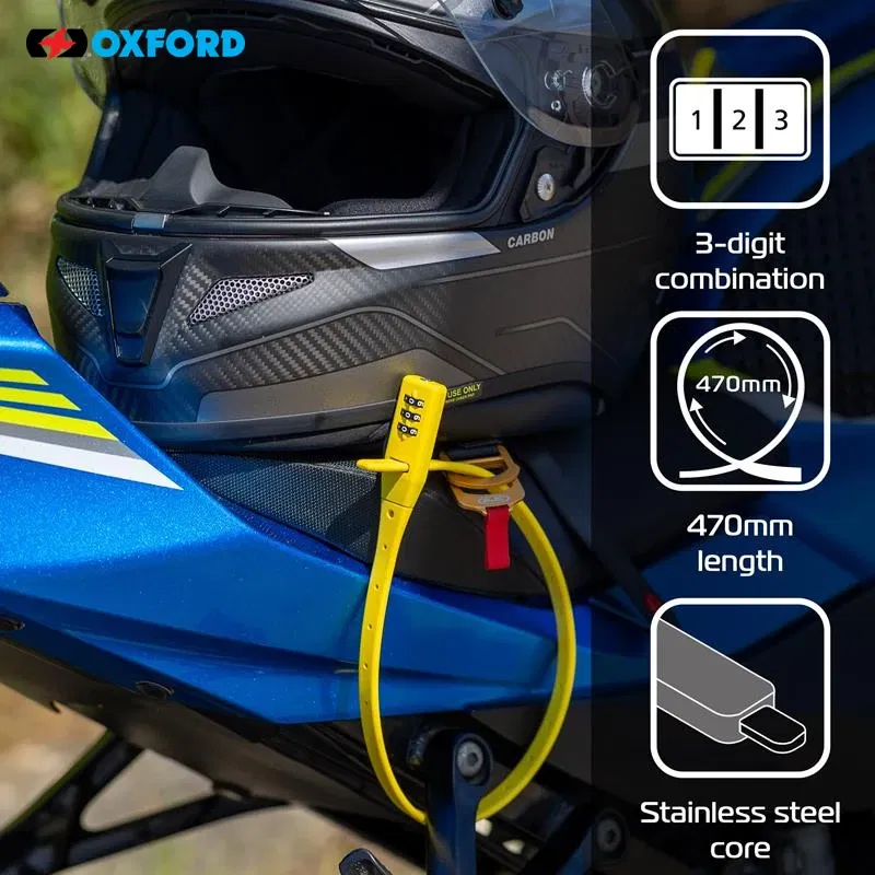 Zasady bezpieczeńśtwa i użytkowania: OXFORD ZABEZPIECZENIE ANTYKRADZIEŻOWE COMBI DO KASKU, ROWERU ITD. KOLOR ŻÓŁTY FLUO (ZAMKNIĘCIE NA SZYFR) kod ean 5030009419133