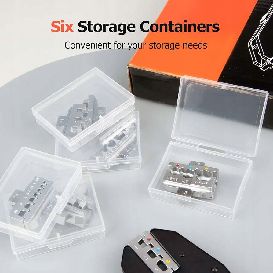 Zestaw narzędzi do zaciskania – zestaw zawiera narzędzie do zaciskania z wymiennymi matrycami i 6 różnych matryc do zaciskania, wszystkie zapakowane w poręczną walizkę do przechowywania.