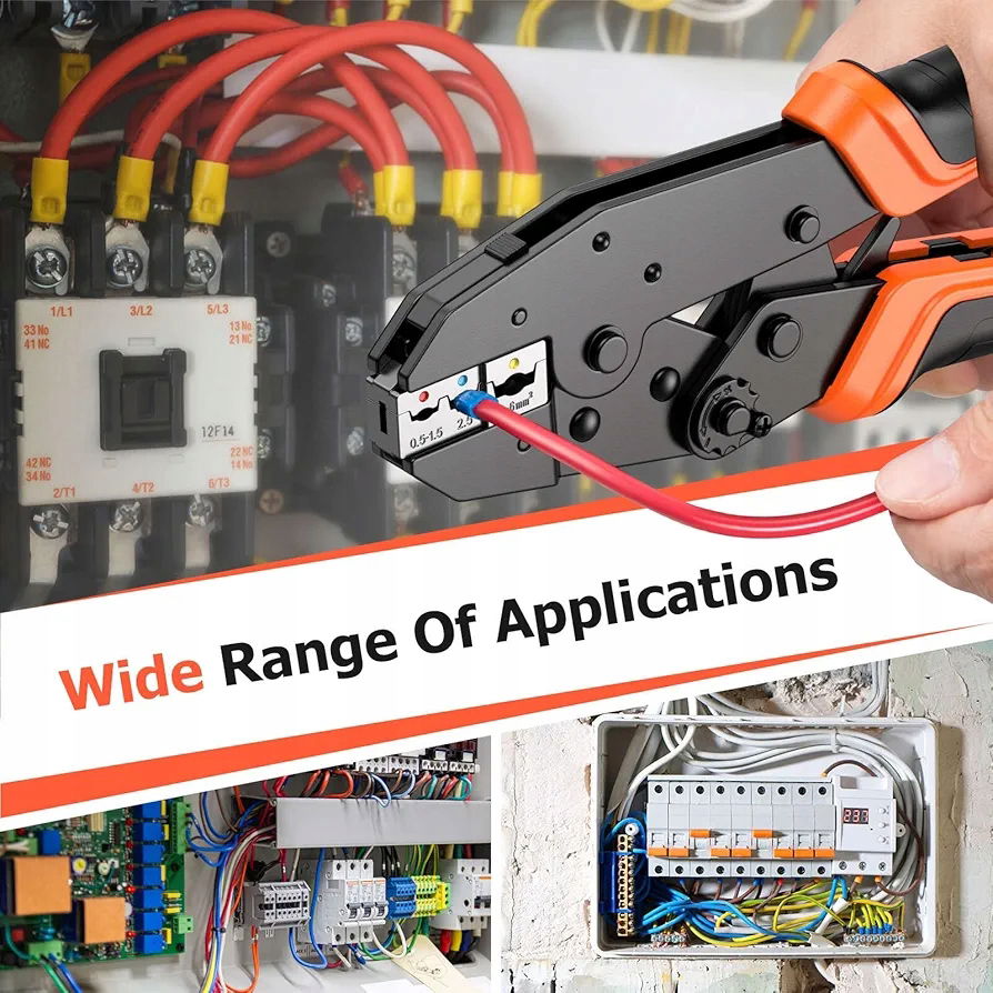 Uniwersalny zestaw narzędzi do zaciskania - zdolny do obsługi termokurczliwych, nieizolowanych zacisków, otwartych beczek, izolowanych i nieizolowanych tulei.