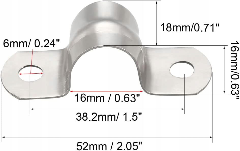 - Wymiary: Pasuje do rury o średnicy: 16 mm/1,38 cala; Średnica otworu montażowego: 6 mm/0,24 cala; Wymiary całkowite: 52 x 18 x 16 mm/2,05" x 0,71" x 0,63" (dł.*szer.*wys.); Grubość: 0,6 mm; Kolor: srebrny