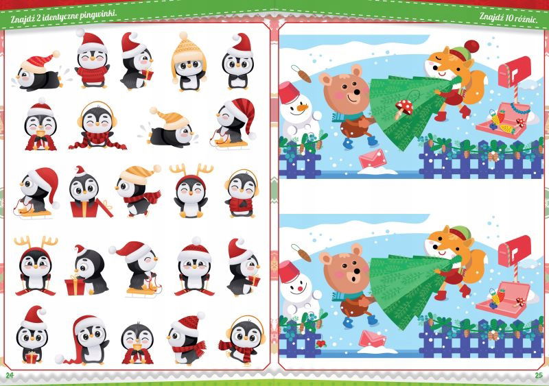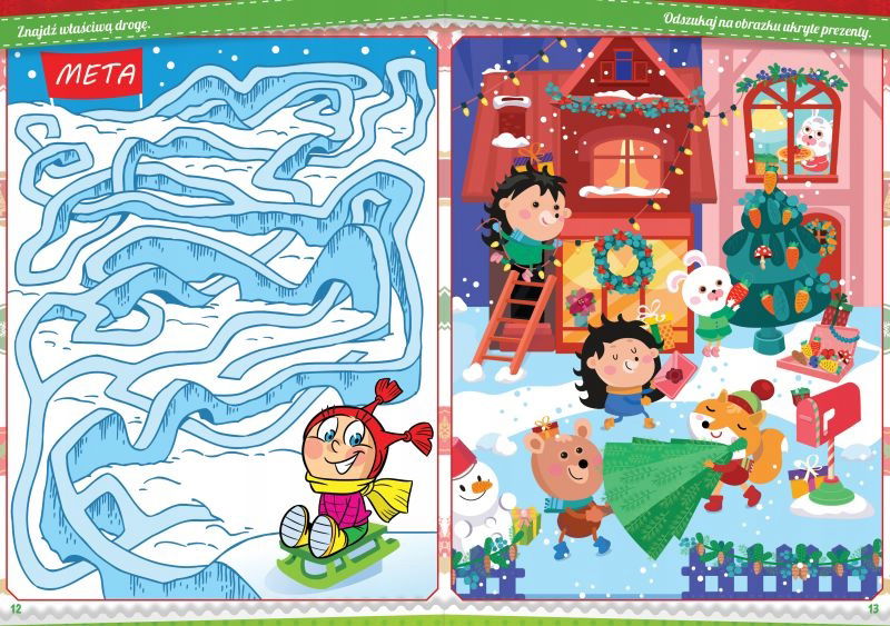 Ta książka to idealny podarunek na Gwiazdkę dla Twojego dziecka. Zapewni mu mnóstwo frajdy i kreatywnej zabawy w towarzystwie sympatycznych bałwanków, wesołych reniferów i magicznych elfów. Labirynty, wyszukiwanie różnic między obrazkami, odnajdywanie cieni i wiele innych ciekawych łamigłówek czeka na Twoją pociechę.