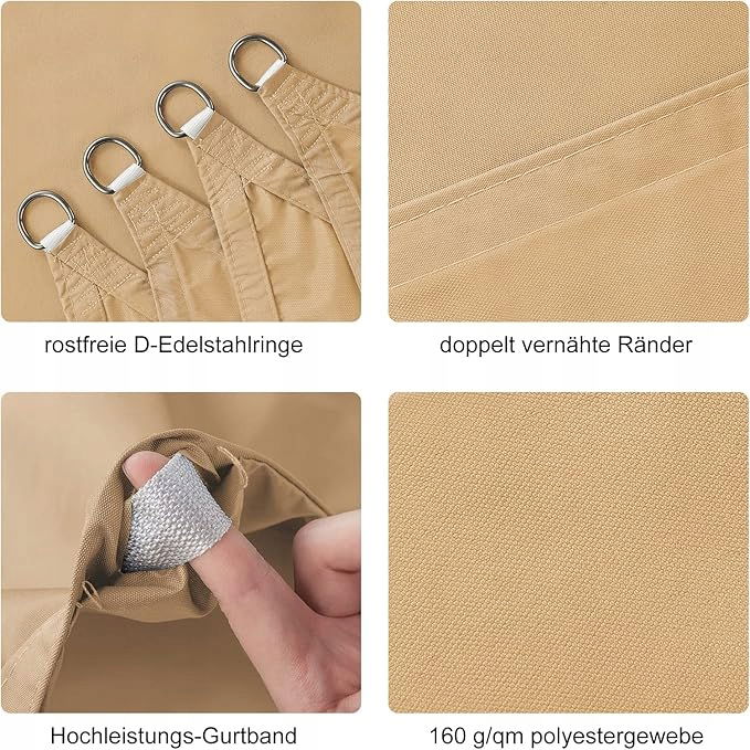 - Wysoka jakość: Żagiel przeciwsłoneczny wykonany jest z materiału PES o gramaturze 160 g/? i charakteryzuje się wysoką odpornością na rozciąganie, starzenie, korozję i promieniowanie. W rogach dodano taśmę o długości 18 g/? 60 cm, a proces wielokrotnego szycia zapobiega rozdarciu tkaniny cieniującej. W każdym rogu zastosowano pierścienie typu D ze stali nierdzewnej 304, aby zapewnić doskonałą stabilność. Aby uniknąć uszkodzenia żagla cieniującego, zaleca się przechowywanie żagla cieniującego podczas złej pogody.