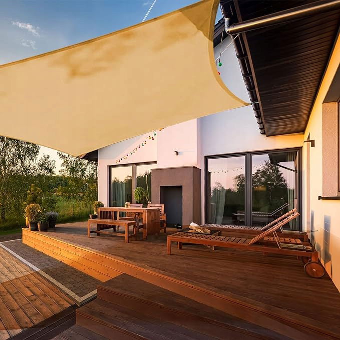 - Ochrona przeciwsłoneczna i wodoodporność: Ten żagiel przeciwsłoneczny z filtrem SPF 50+ może blokować ponad 98% promieni UV. Dodatkowo powierzchnia posiada dwuwarstwową powłokę PU, która zapewnia doskonały efekt wodoodporny. Niektóre żagle o dużych rozmiarach są wykonane z dwóch kawałków materiału, a szwy są zabezpieczone prasowanym na gorąco klejem, który zapobiega wyciekaniu wody ze szwów. Odporność na ciśnienie wody: 700 mm HH