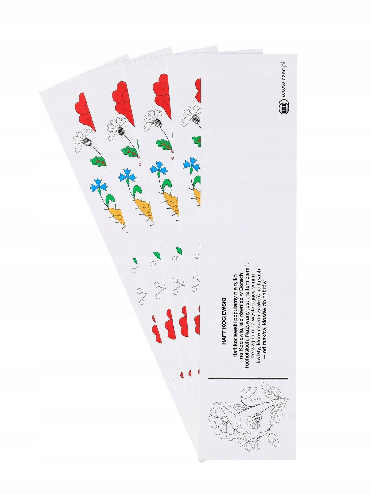 Jedna strona przedstawia tradycyjny haft kociewski z drugiej znajduje się opis haftu. Zakładka wykonana z kartonu pokrytego błyszczącą folią. Idealny dodatek do kompletu z książką.
