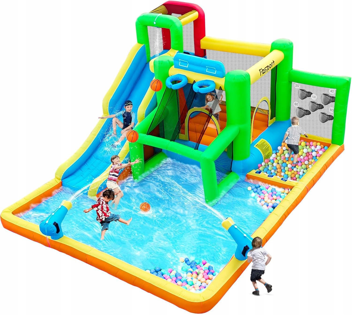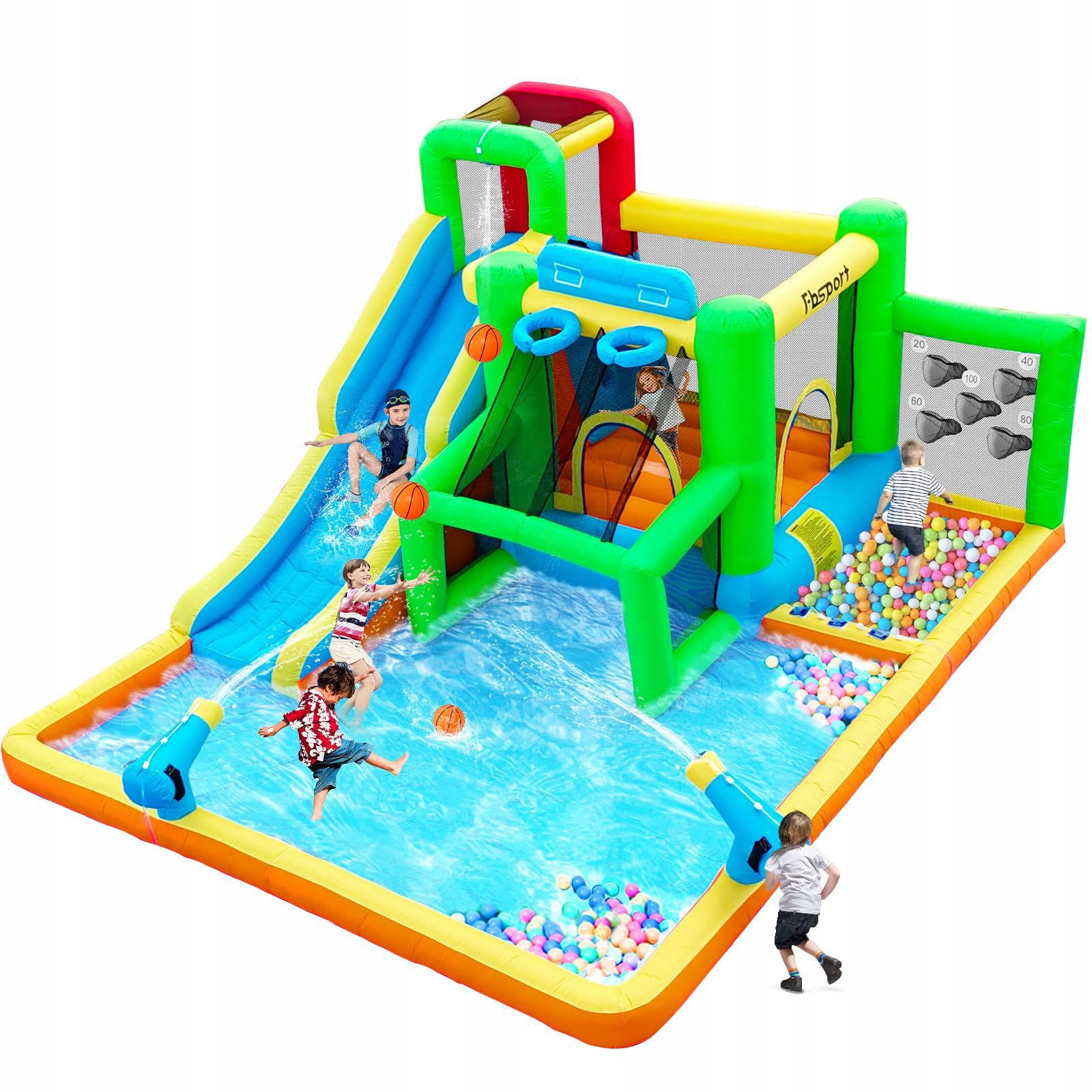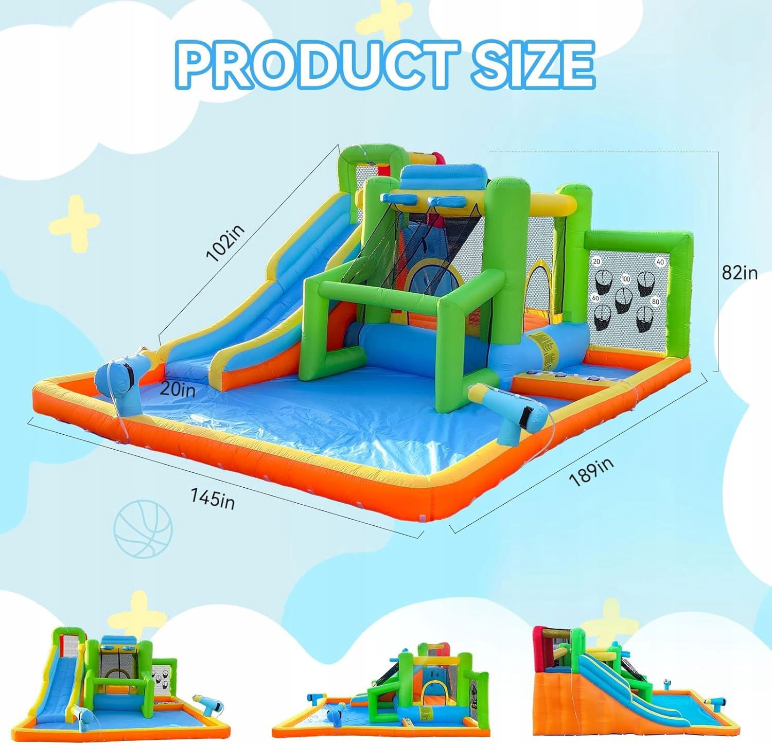 Zamek dmuchany dla dzieci oferuje niekończącą się zabawę dzięki dużej powierzchni do skakania i zjeżdżalni z systemem zraszającym. Idealny na każdą porę roku, wspiera rozwój fizyczny i emocjonalny dzieci.