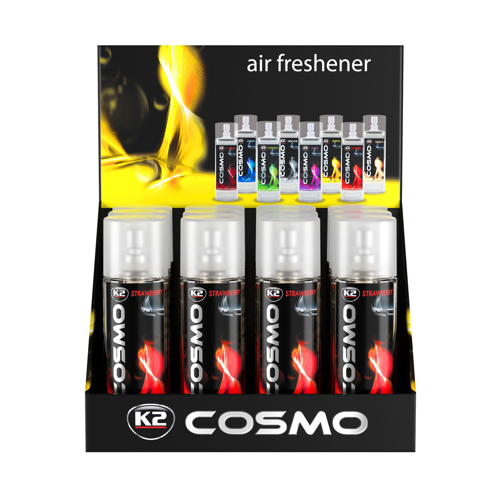 Subtelna kompozycja odświeżaczy K2 COSMO neutralizuje wszelkie niepożądane zapachy. Sposób użycia K2 COSMO pozwala na bezpośrednią aplikację zapachu, przez co możemy nadać wnętrzu niepowtarzalny charakter o wybranej intensywności. Dzięki silnie skoncentrowanej formule K2 COSMO odświeży wnętrze Twojego auta zawsze wtedy, kiedy tego potrzebujesz. K2 COSMO najlepiej rozpylić na miejsca materiałowe, dywaniki samochodowe czy tapicerowane elementy, z których zapach będzie doskonale odparowywał.
