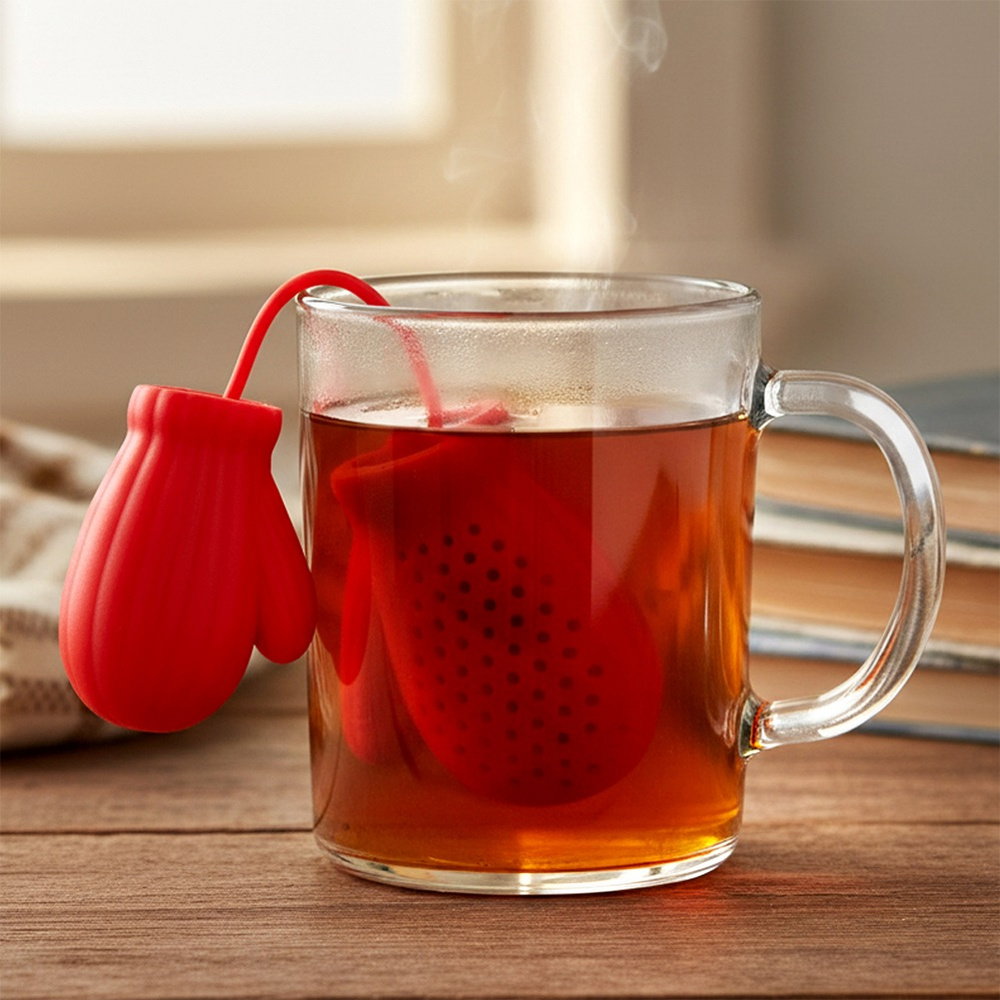 Zimowy design - Kształt czerwonej rękawiczki to wesoły akcent, który doskonale wpisuje się w zimową i świąteczną atmosferę. Odpowiedni kształt zaparzacza pozwala na wygodne oparcie go o brzeg kubka lub szklanki.