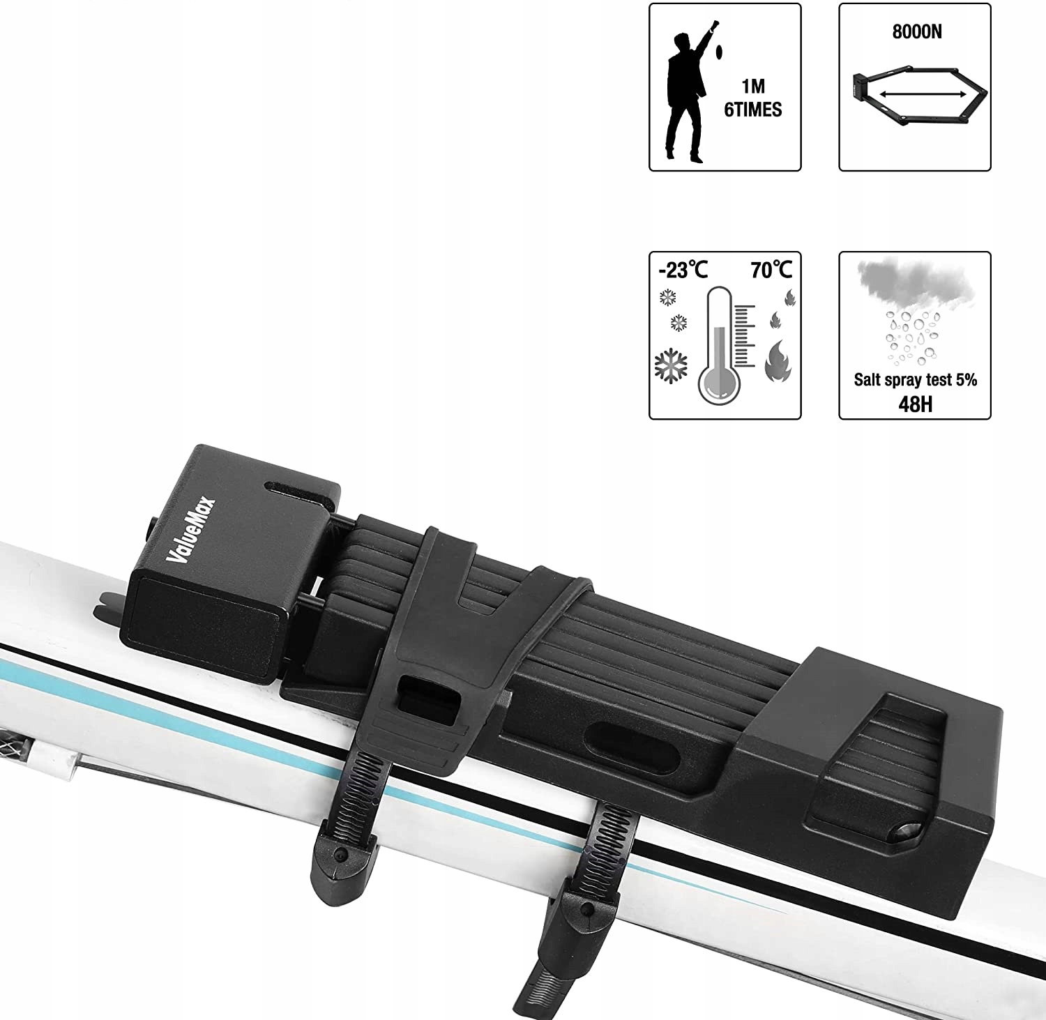 Blokada antywłamaniowa ma doskonałą odporność na wysokie i niskie temperatury, jest w stanie wytrzymać różne zewnętrzne warunki pogodowe; łańcuch pokryty jest wysokiej jakości powłoką, która jest odporna na utlenianie i korozję oraz przedłuża żywotność; dziurka od klucza jest wodoodporna i pyłoszczelna.