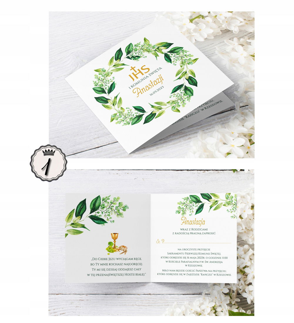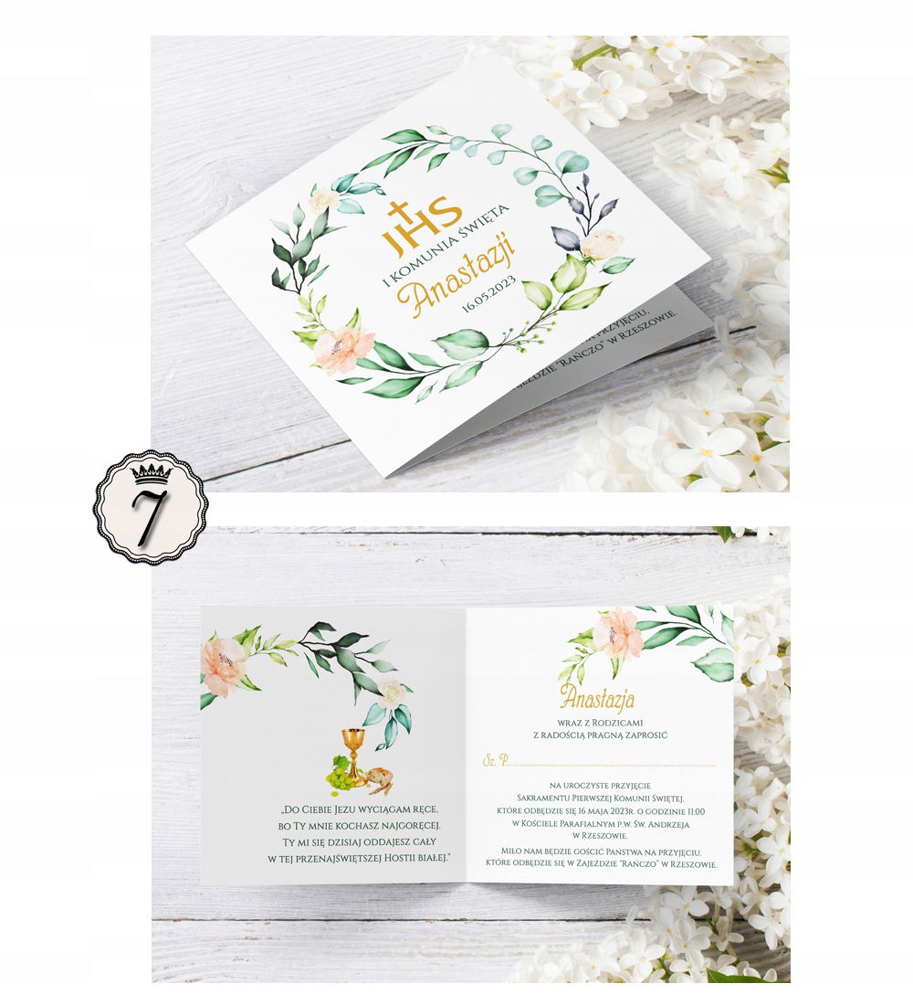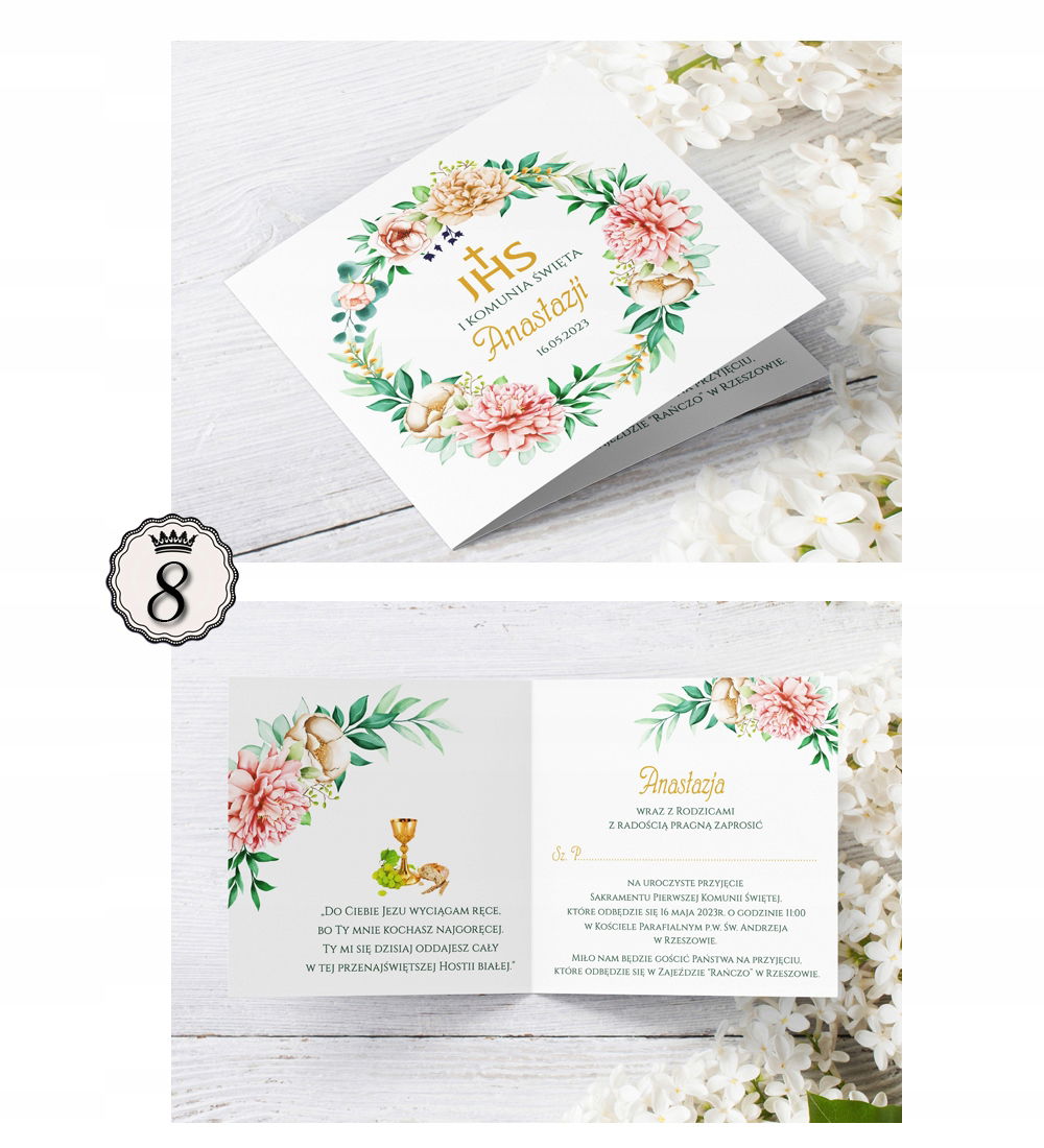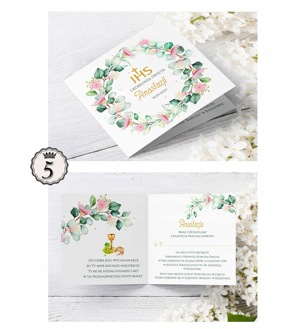 Zaproszenia komunijne z kwiatowymi wiankami.