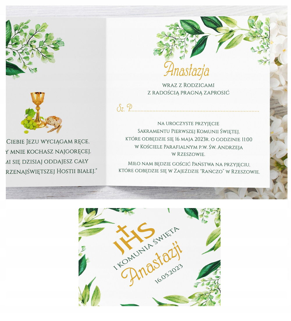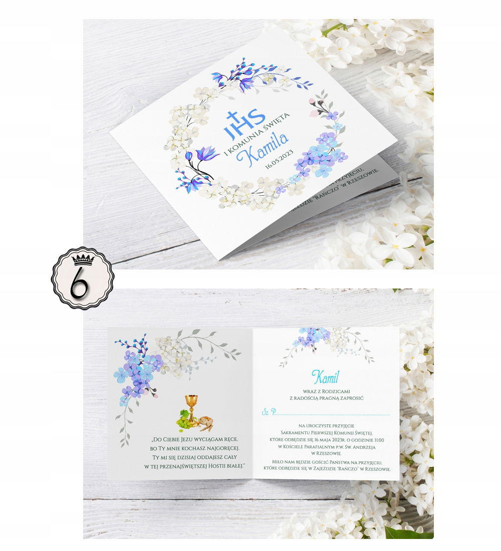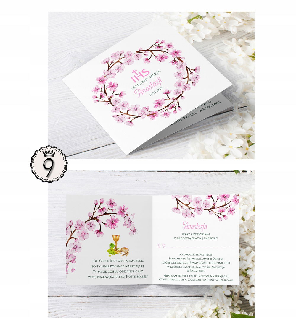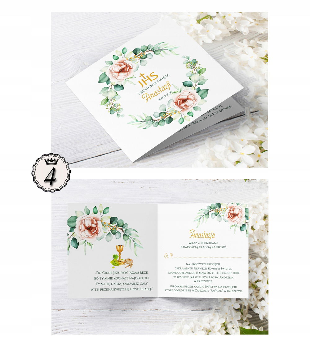 Zaproszenia komunijne z kwiatowymi wiankami.