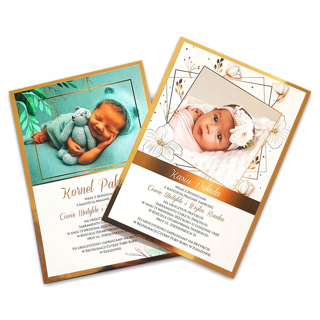 Zaproszenia na chrzest ze zdjęciem dziecka na złotym, lustrzanym podkładzie z personalizacją + koperta