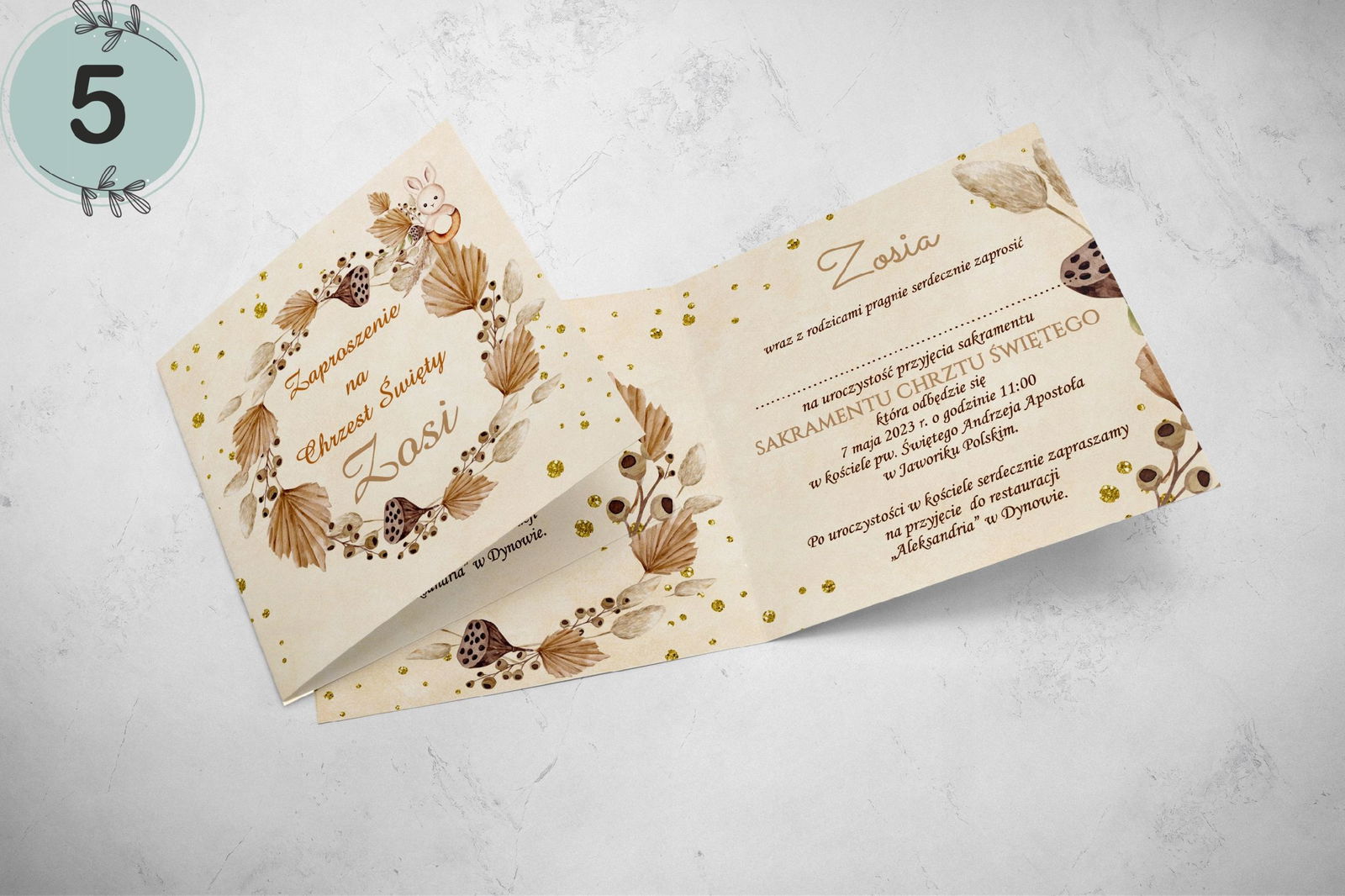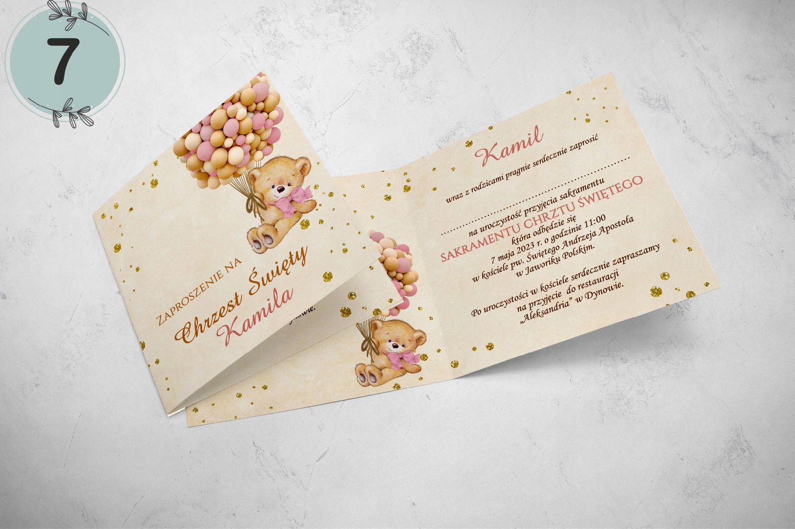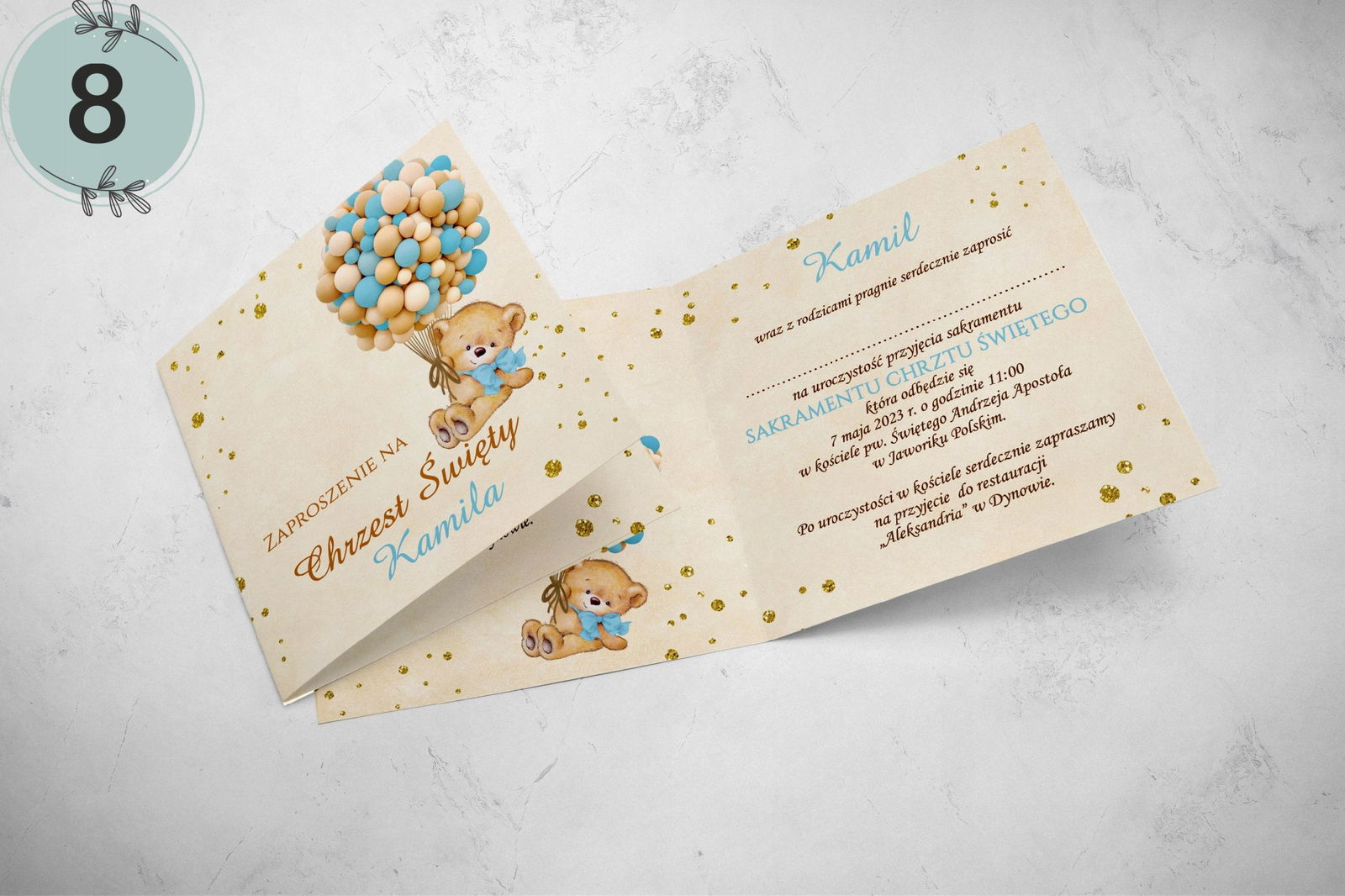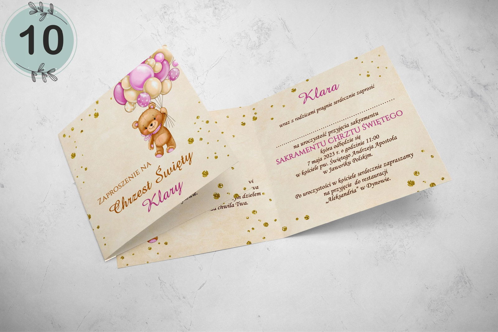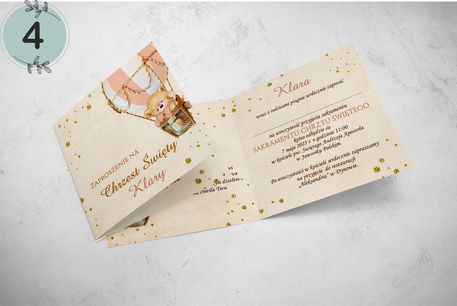 - dane: imię dziecka, data i godzina chrztu, kościół, miejsce przyjęcia.