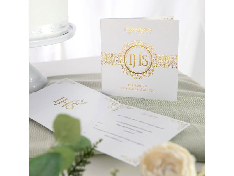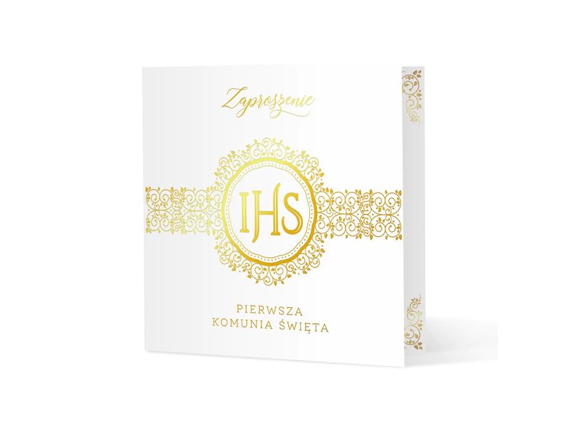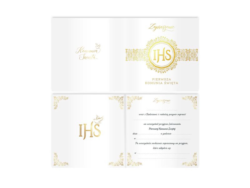 Piękne, tradycyjne zaproszenie na uroczystość Pierwszej Komunii Świętej i przyjęcie w tonacji biało złotej. Produkt posiada śliczny motyw, który spodoba się każdemu - uniwersalny bez zbędnych udziwnień.