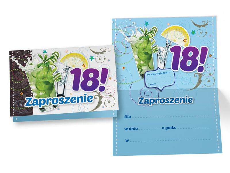 Piękne, tradycyjne zaproszenie na urodziny z motywem dla dziecka "18 (osiemnastka), drinki dla chłopaka". Zestaw zawiera 5 sztuk zaproszeń wraz z kopertami do własnoręcznego uzupełniania danych. Spraw, aby ten wyjątkowy dzień był najlepszym dniem w życiu Twojego dziecka. Każdy najmniejszy szczegół ma znaczenia estetyczne, które zostanie zapamiętane wśród rówieśników.