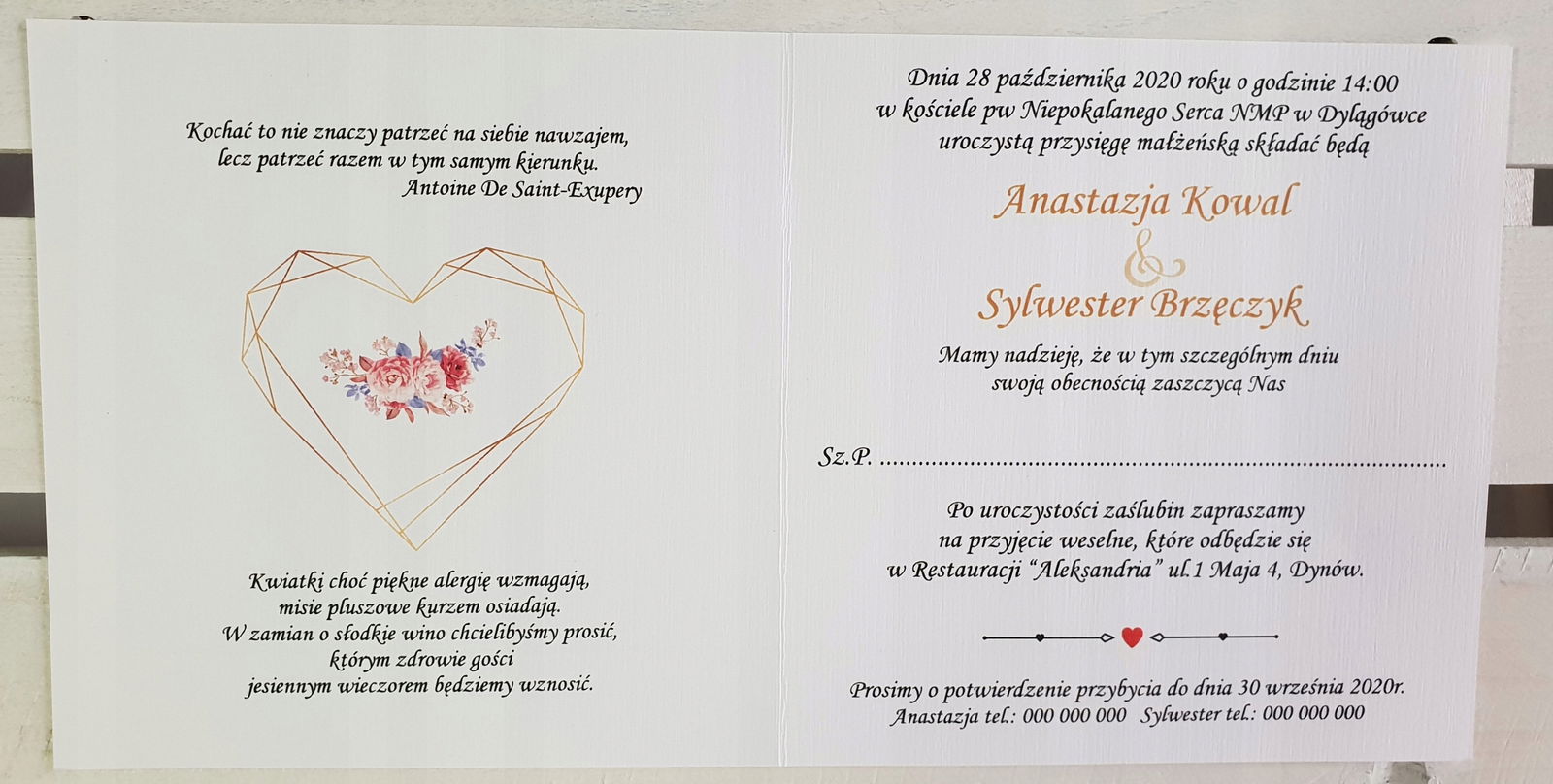 - DANE DO ZAPROSZENIA ( Dane nowożeńców, kościół, data,godzina, miejsce przyjęcia, data potwierdzenia, telefony,cytat )