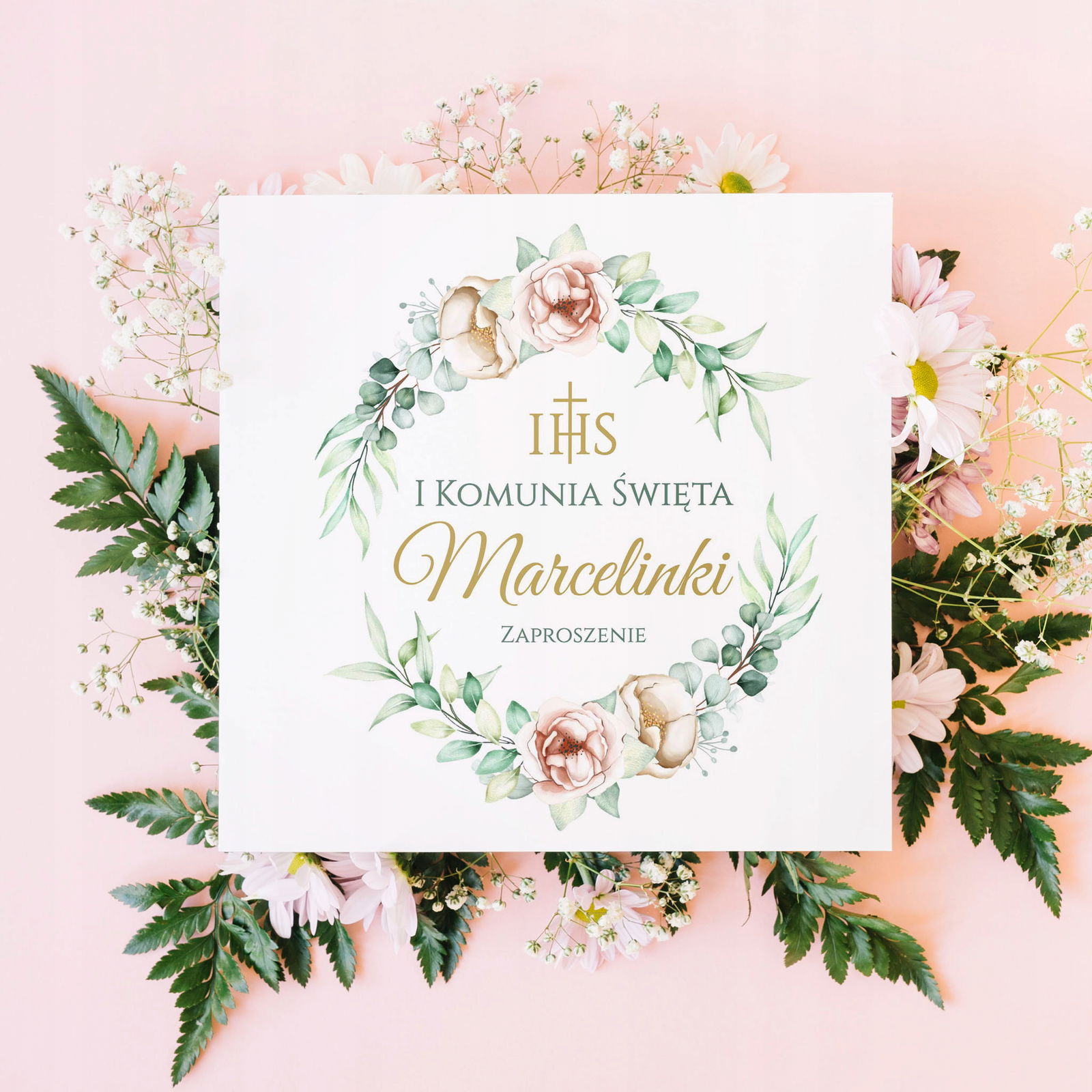 Zaproszenie komunijne z kopertą, kwiaty wianki 10 szt.