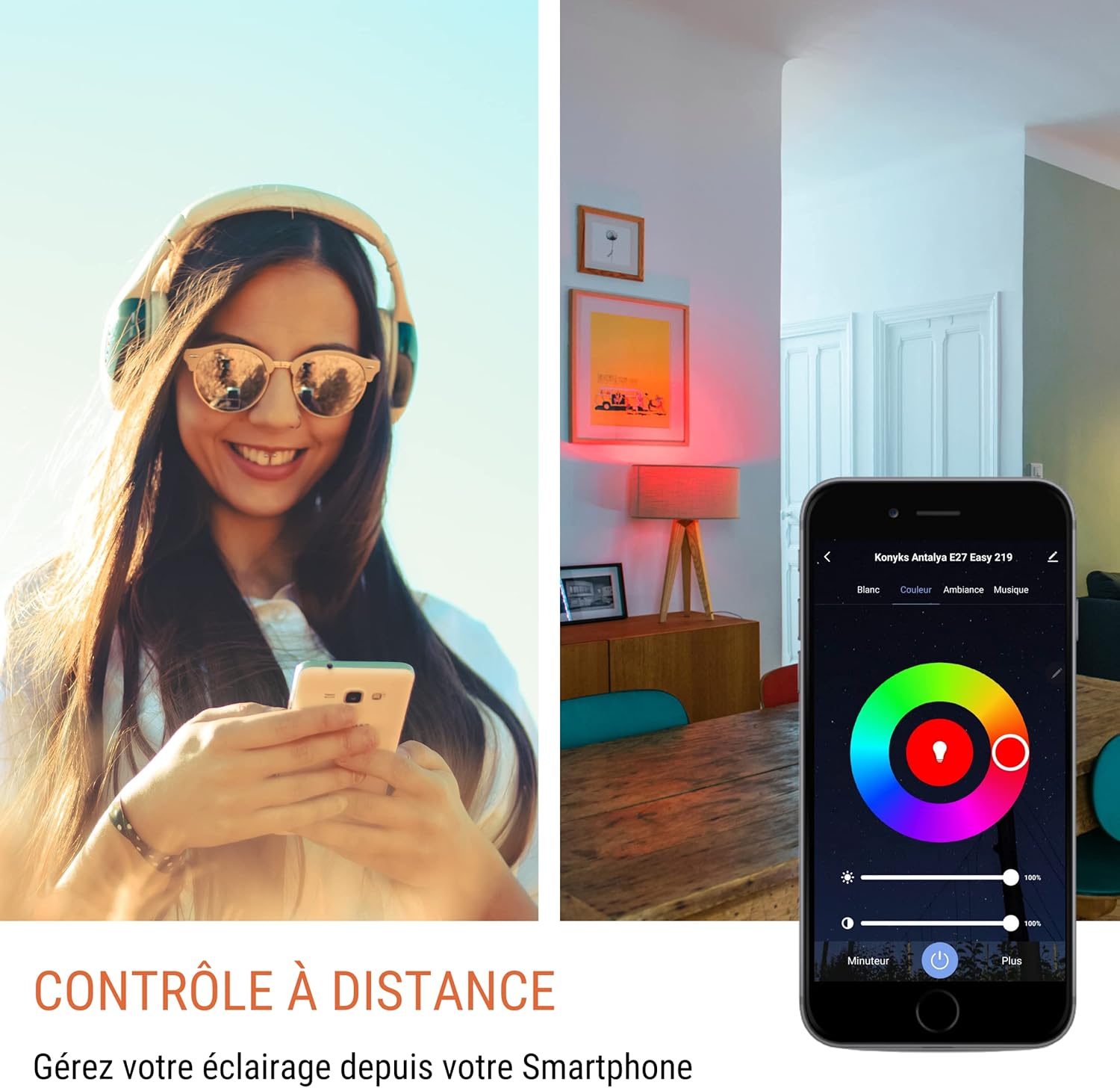 - Barwy światła: Pełna paleta kolorów (RGB) + regulowana biel (od ciepłej do zimnej)