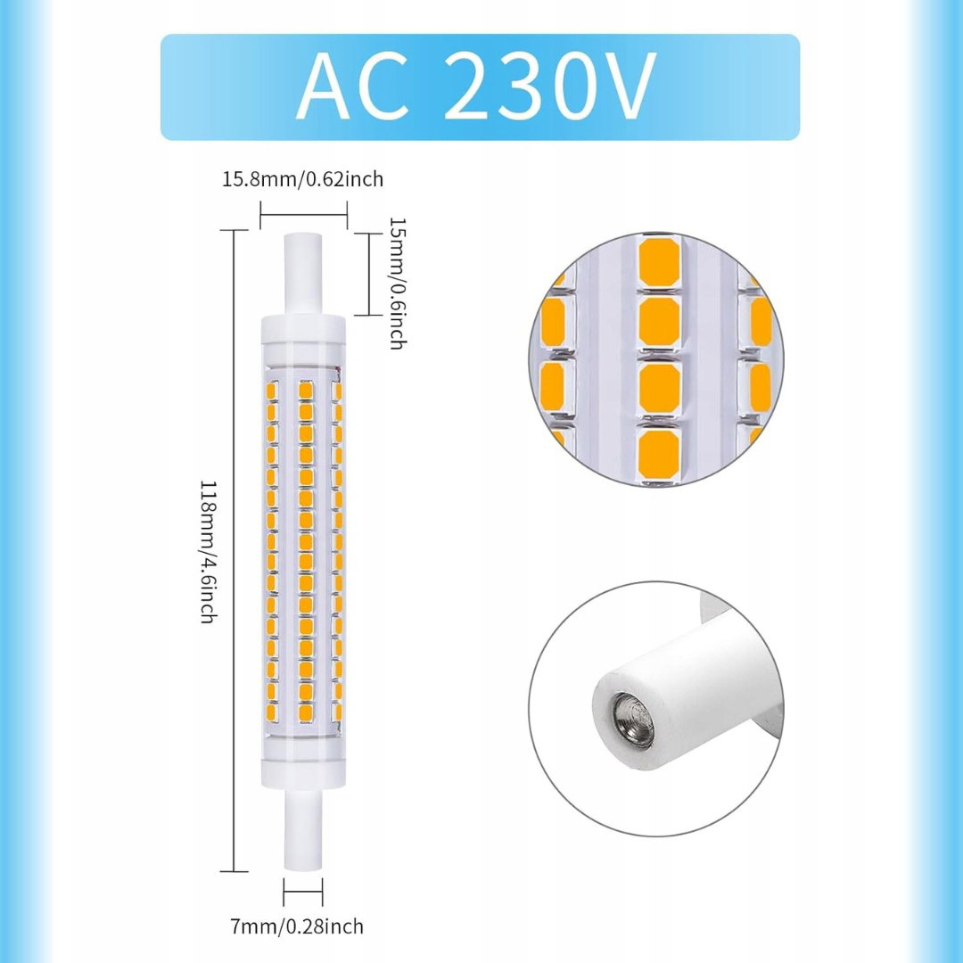 - Łatwa Instalacja: żarówka pasuje do większości standardowych opraw z mocowaniem R7S, wyposażona jest w wysokiej jakości diody LED i ceramiczną podstawę zapewniającą skuteczne odprowadzanie ciepła, co zwiększa jej trwałość i bezpieczeństwo w porównaniu z halogenami. Produkt nie zawiera ołowiu ani rtęci i nie emituje promieniowania UV ani IR, dzięki czemu jest przyjazny dla środowiska.