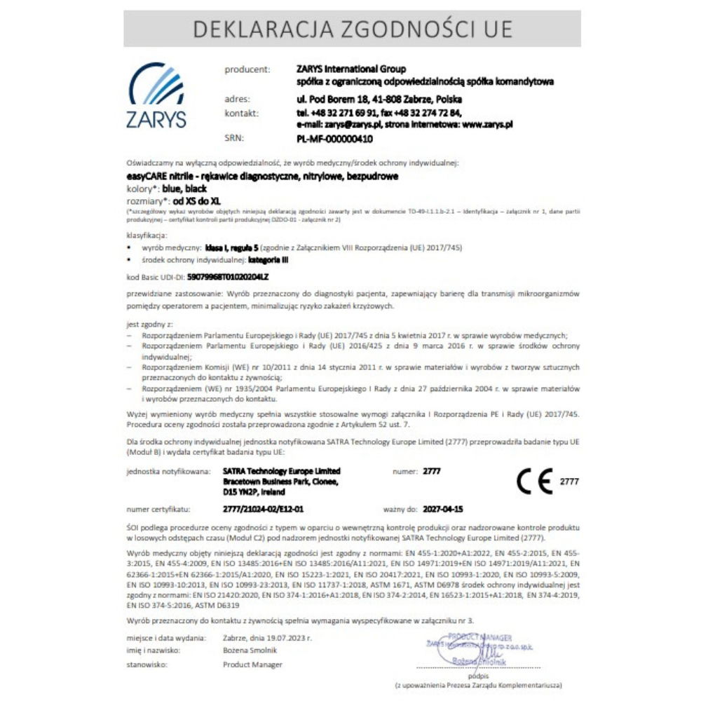 Jednorazowe rękawice diagnostyczne ZARYS EasyCare wykonane z nitrylu (akrylonitryl-butadien), cechujące się bezpudrową konstrukcją oraz chlorowaną powierzchnią wewnętrzną. Produkt niesterylny, zgodny z wieloma normami technicznymi, dopuszczony do kontaktu z żywnością. Mikrotekstura na całej powierzchni oraz dodatkowa tekstura na końcach palców zapewniają pewny chwyt i precyzję pracy. Rękawice wyposażone w rolowany mankiet dla łatwego zakładania i zdejmowania.