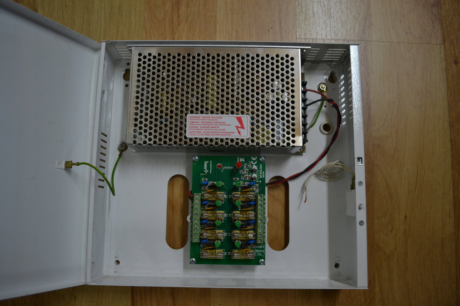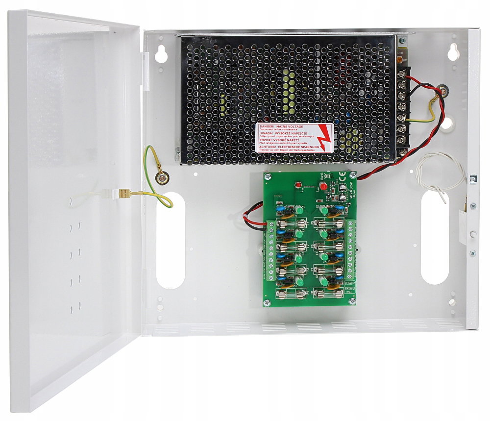 Zasilacz stabilizowany PSDC08128 przeznaczony jest do zasilania kamer analogowych lub innych urządzeń wymagających stabilizowanego napięcia o wartości 12V DC. Zakres regulacji napięcia wyjściowego regulowany jest potencjometrem w zakresie 12V÷15V DC. Zasilacz posiada 8 wyjść zabezpieczonych niezależnie bezpiecznikami topikowymi lub polimerowymi PTC. Awaria (zwarcie) w obwodzie wyjścia spowoduje przepalenie bezpiecznika topikowego lub zadziałanie bezpiecznika PTC i odłączenie obwodu od zasilania DC (+U). Zasilacz umieszczony jest w obudowie metalowej z panelem sygnalizacyjnym wyposażonej w mikroprzełącznik sygnalizujący otwarcie drzwiczek (czołówki).