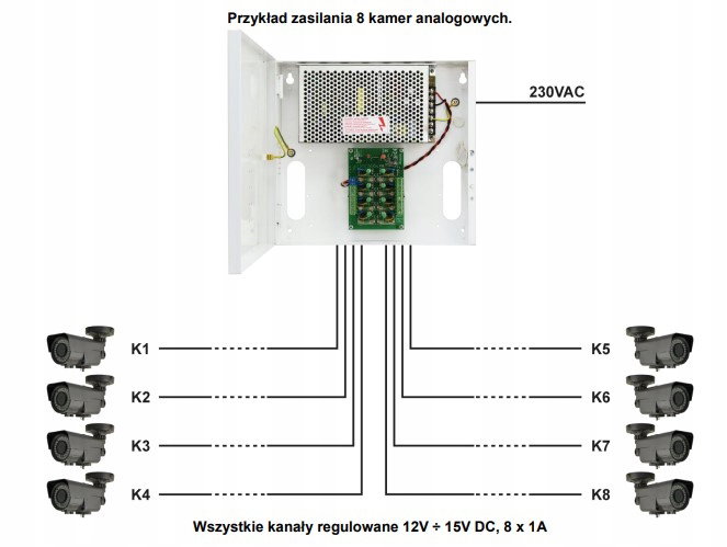 Zasilacz podaje na wyjściu napięcie DC 12V i obsługuje do 8 urządzeń.