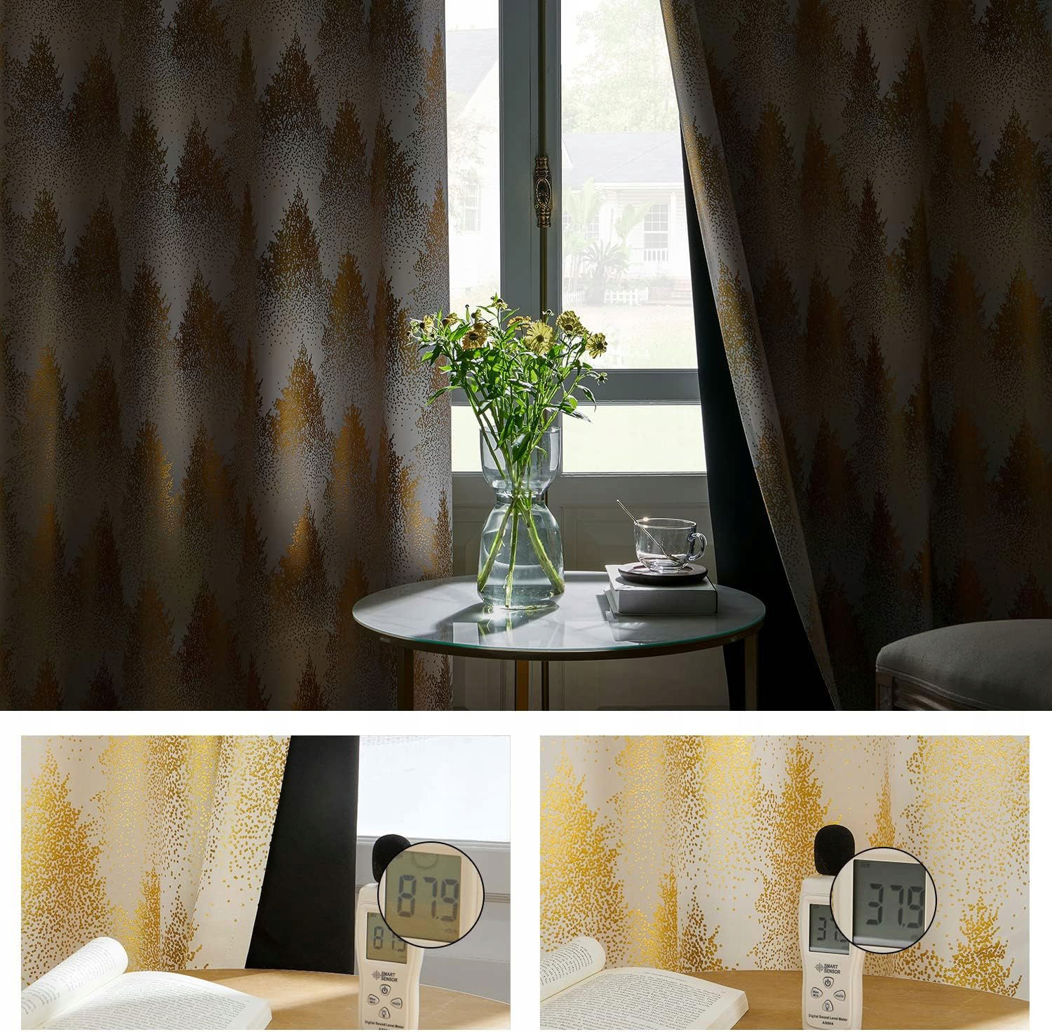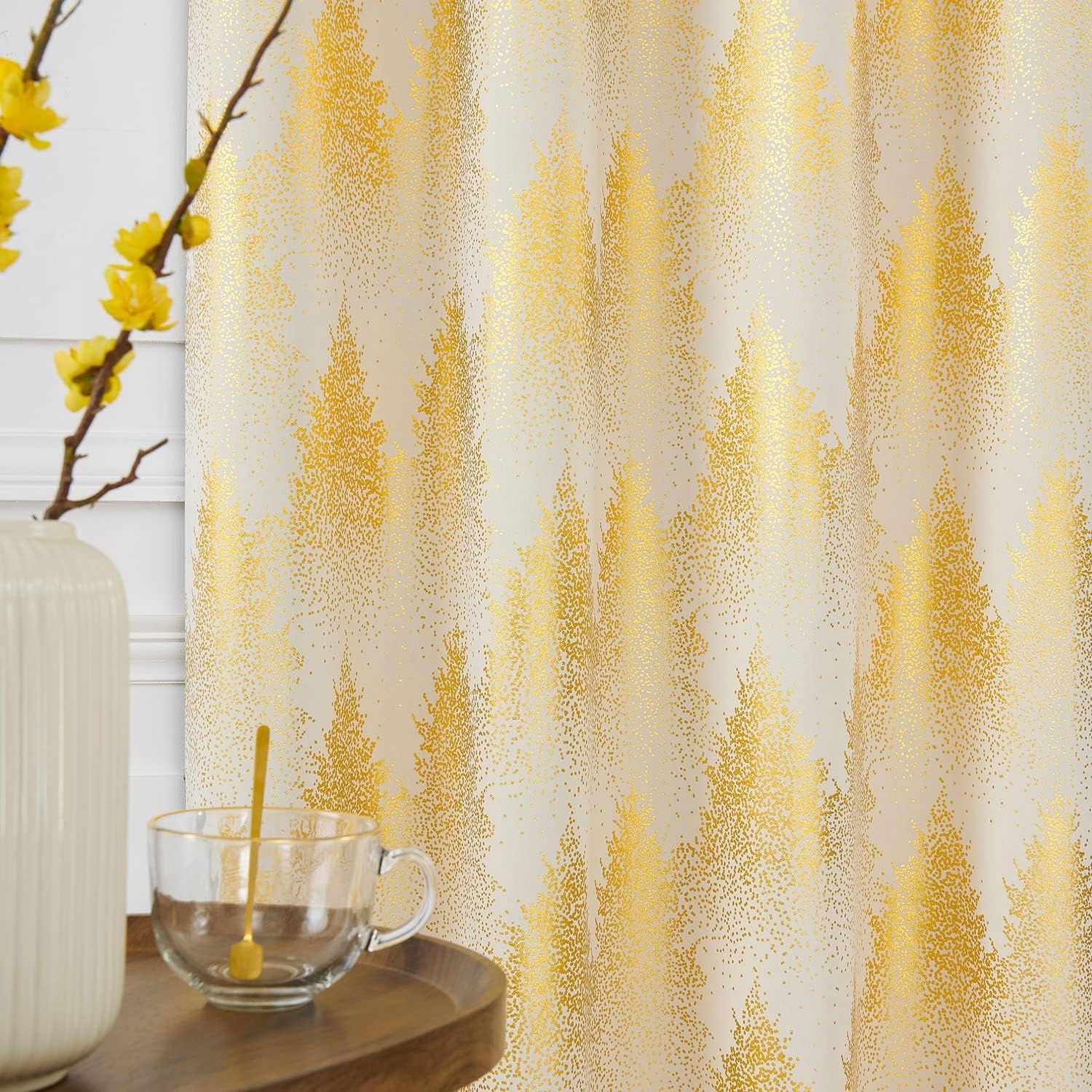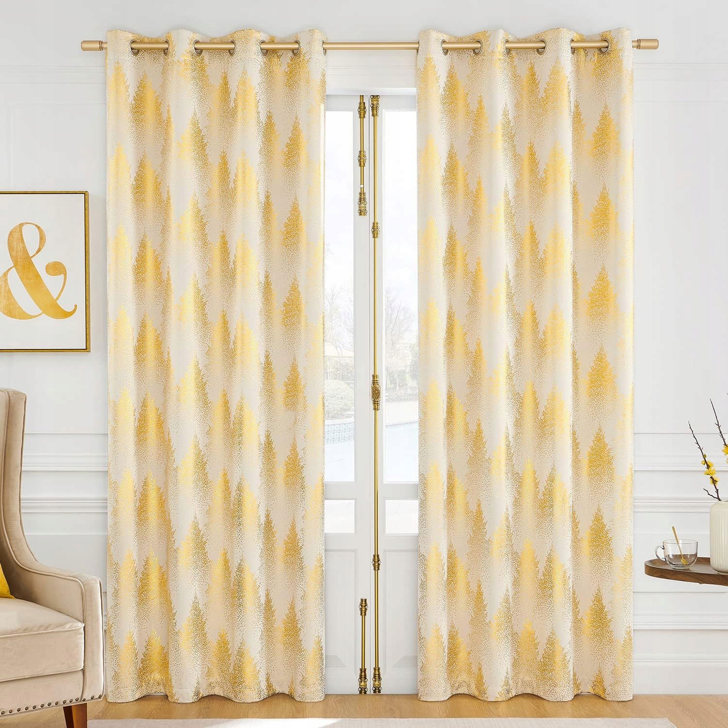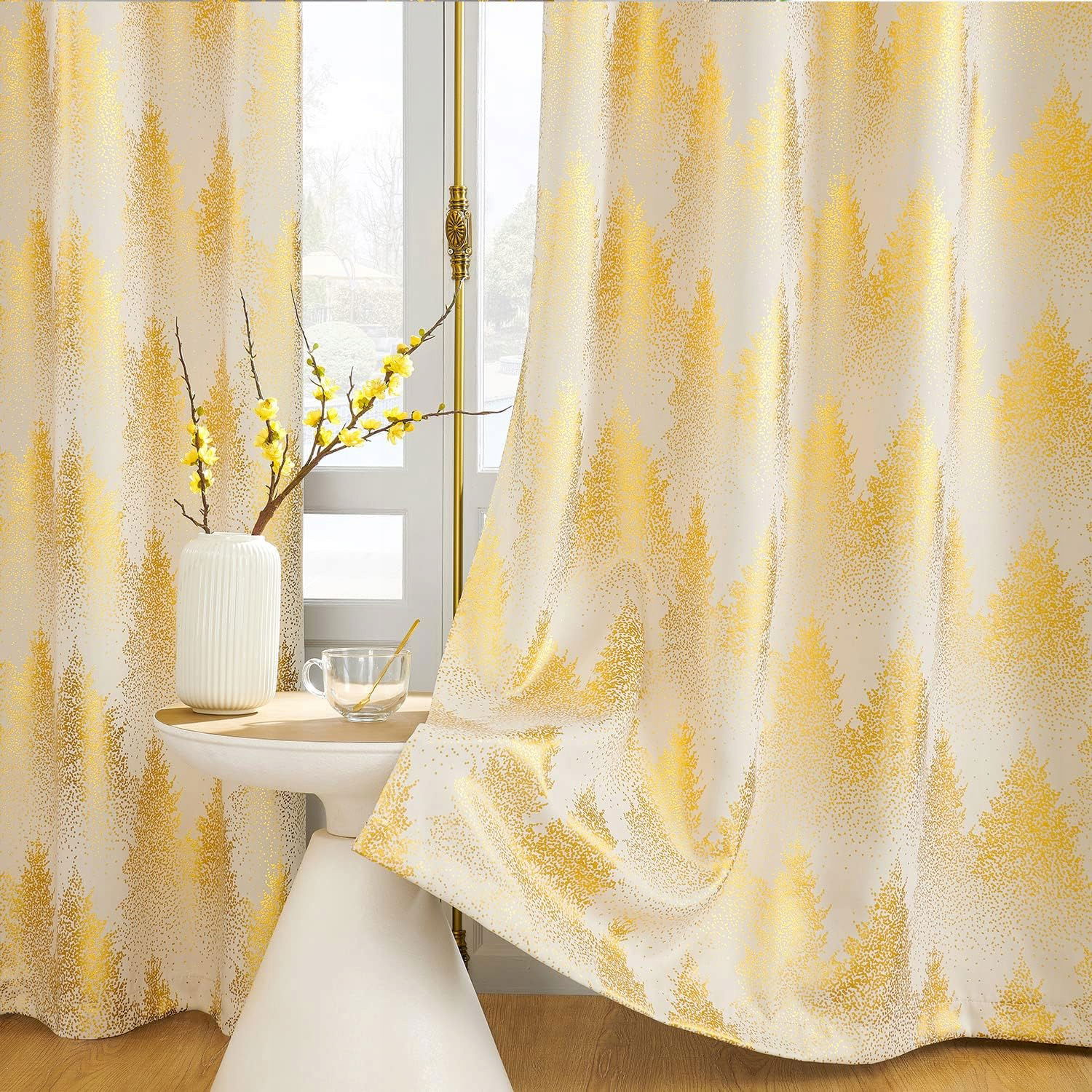 Lśniące zasłony ze złotym wzorem lasu sosnowego wnoszą naturalny wygląd do każdej przestrzeni