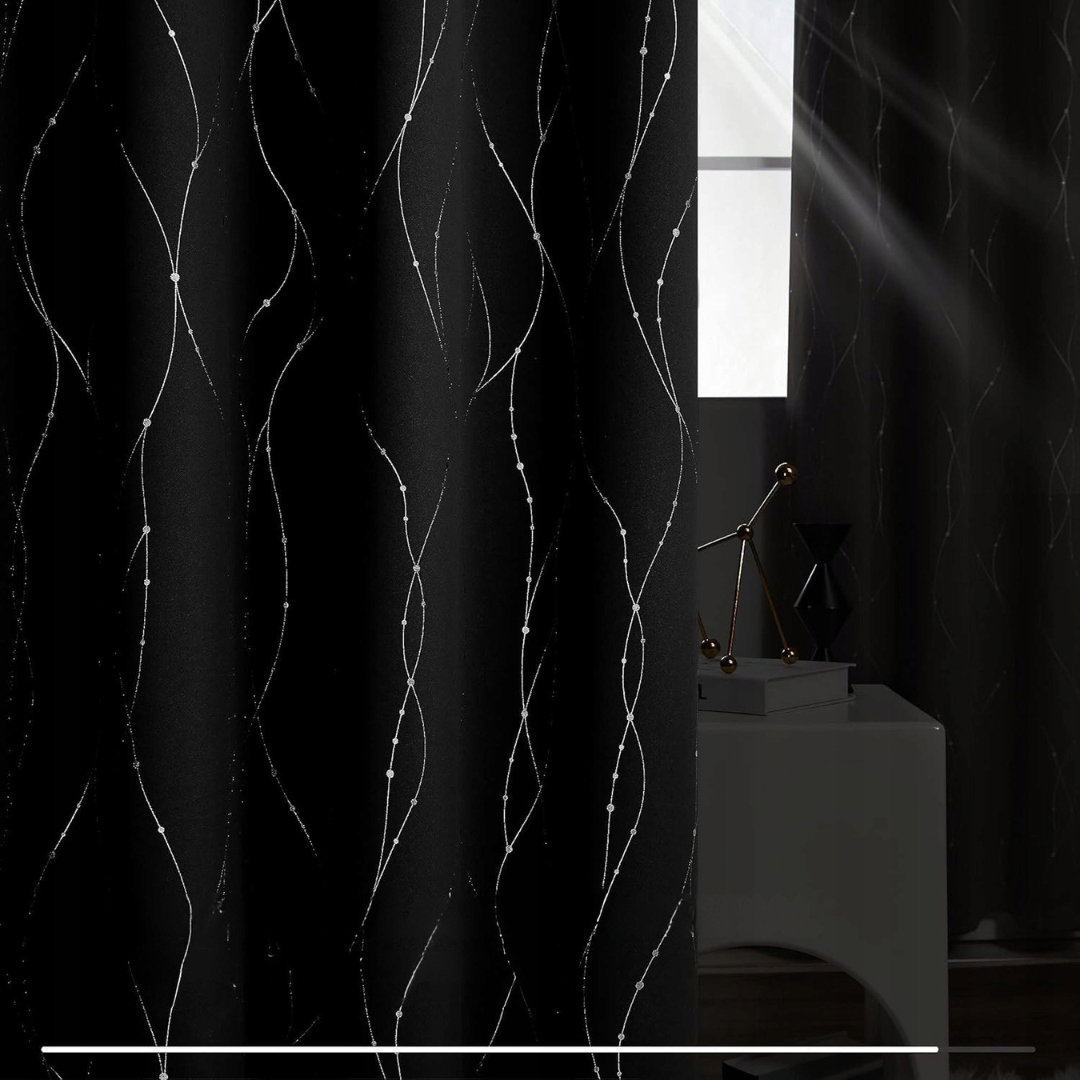 Deconovo zasłony do sypialni – termiczne, zaciemniające zasłony na przelotkach z nadrukiem foliowym w kropkowaną linię, izolujące okno, do salonu, 117 x 138 cm, kolor czarny, zestaw 2 paneli