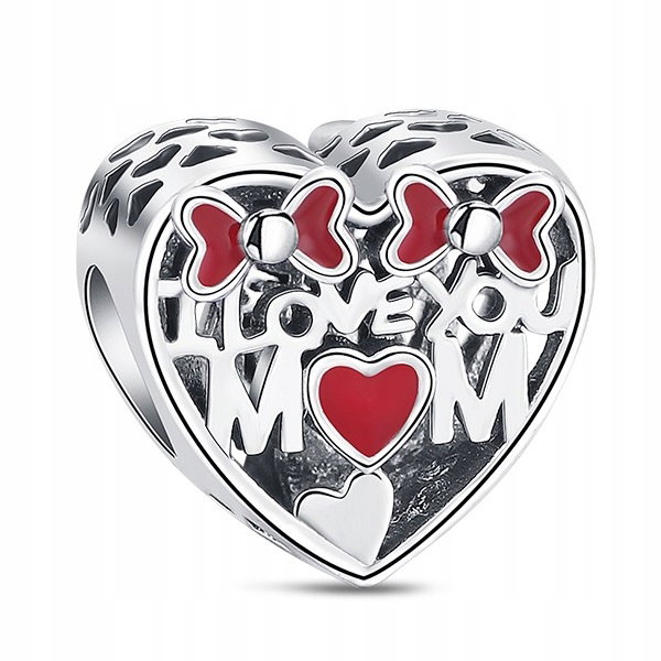 Charms Kocham Mamę to urocza srebrna zawieszka próby 925 w kształcie serca, ozdobiona czerwonymi elementami emaliowanymi oraz delikatnymi kokardkami. Ażurowe wykończenie i napis "I Love You Mom" nadają jej wyjątkowy, sentymentalny charakter. Idealna jako prezent dla mamy, doskonale pasuje do bransoletek modułowych.