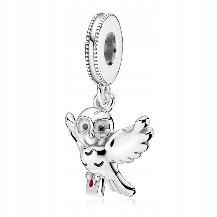 Charms Sowa Hedwiga to wyjątkowa zawieszka wykonana ze srebra próby 925, inspirowana kultową sową z serii Harry Potter. Ozdobiona delikatnymi czarnymi i białymi detalami, ma unikalny design z rozpostartymi skrzydłami i listem z subtelnym czerwonym akcentem. Idealnie pasuje do bransoletek modułowych, dodając magicznego uroku każdej stylizacji.