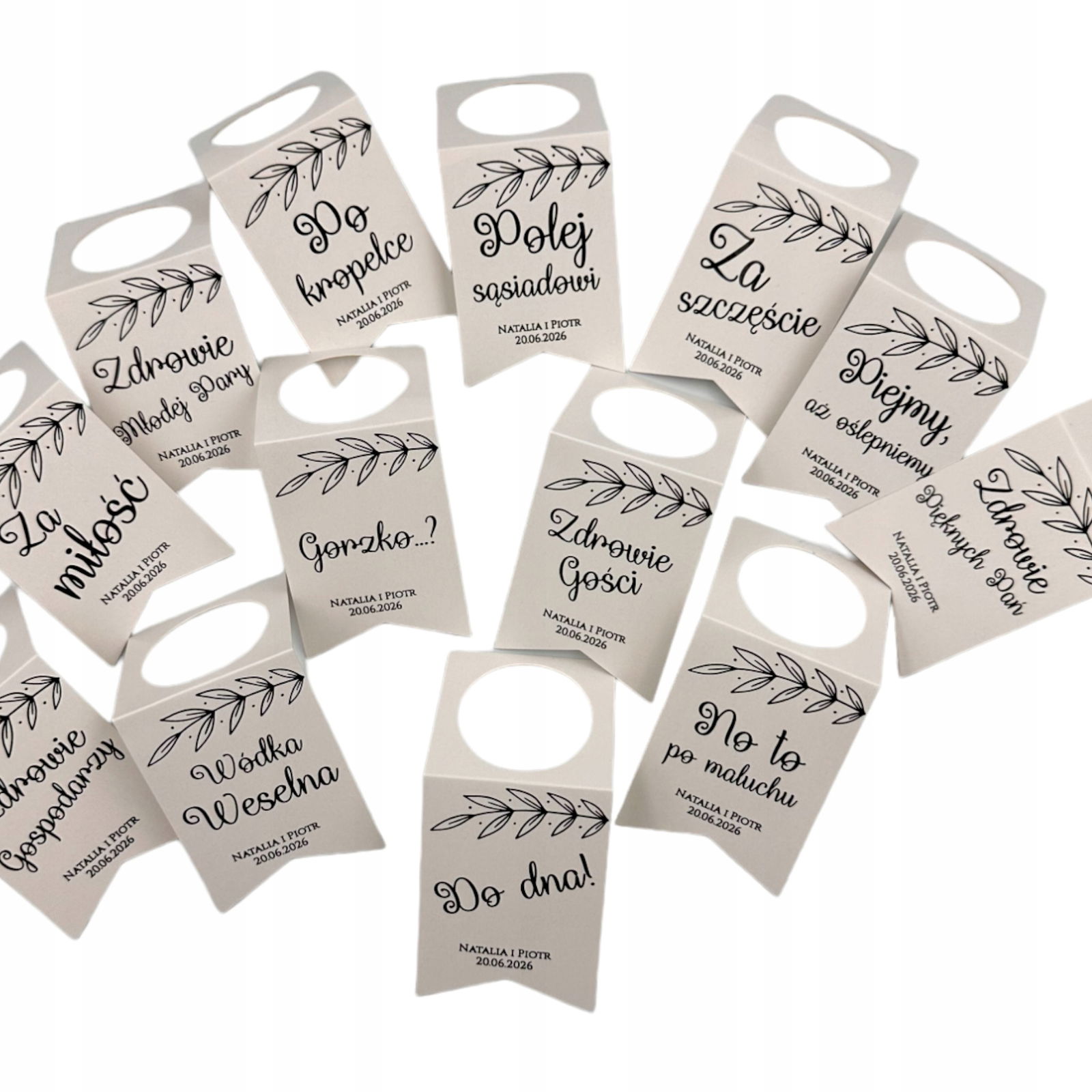 W cenie otrzymają Państwo 1 komplet czyli 50 Sztuk zawieszek spersonalizowanych na alkohol z 24 tekstami