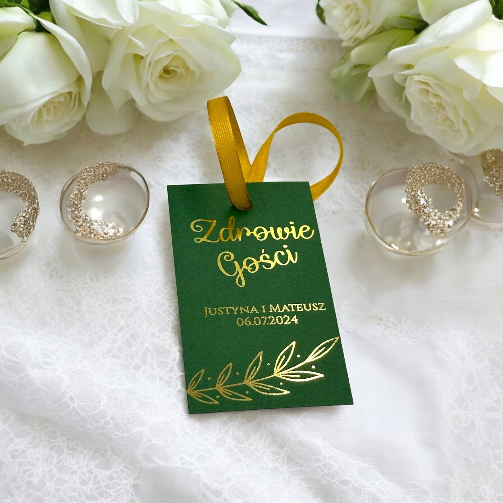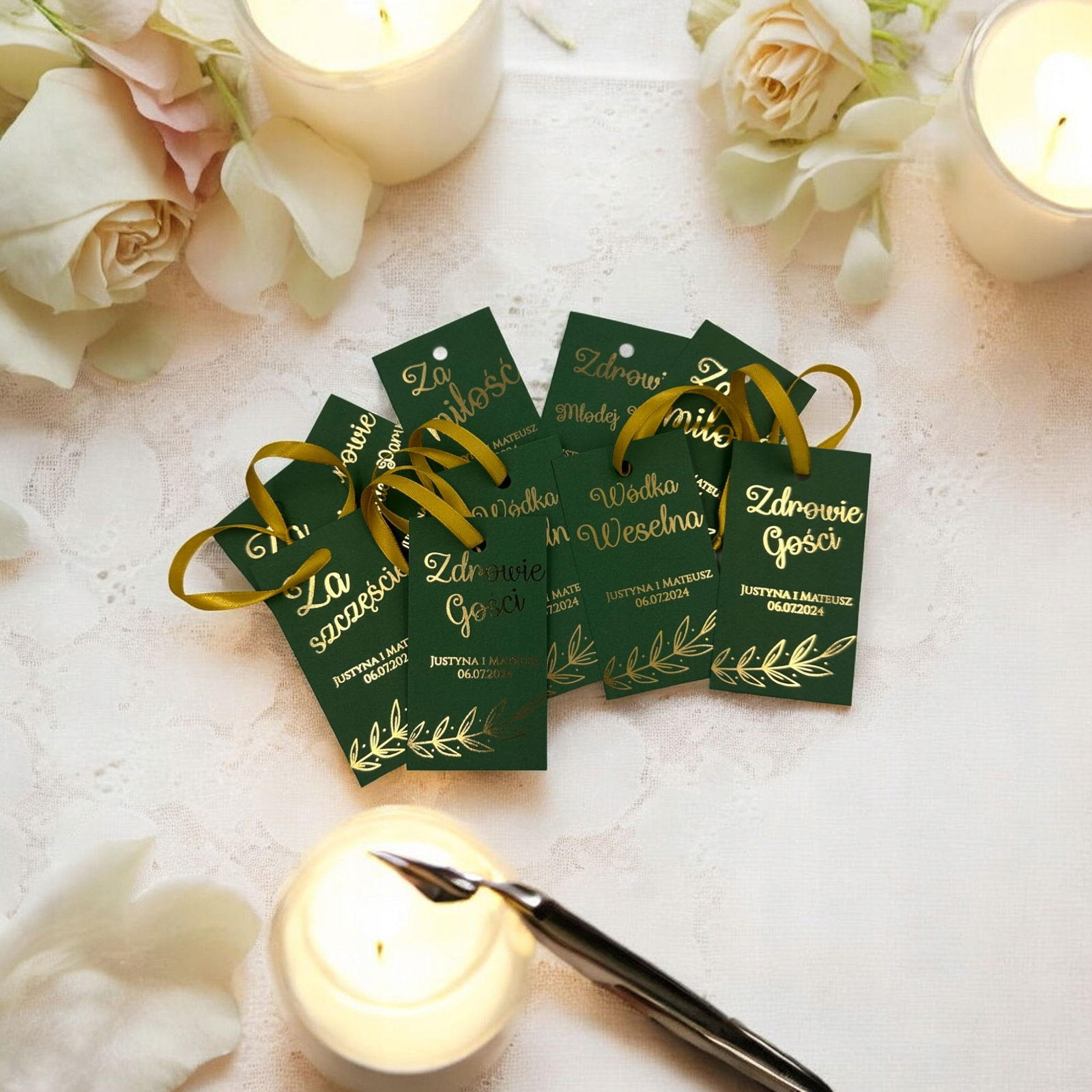 ZAWIESZKI złocone etykiety na alkohol Wódkę Weselną 50szt Zielone PR910